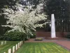 Het Sovjet Ereveld met achter de witte obelisk de muur met de letters ‘Lof aan de helden’.