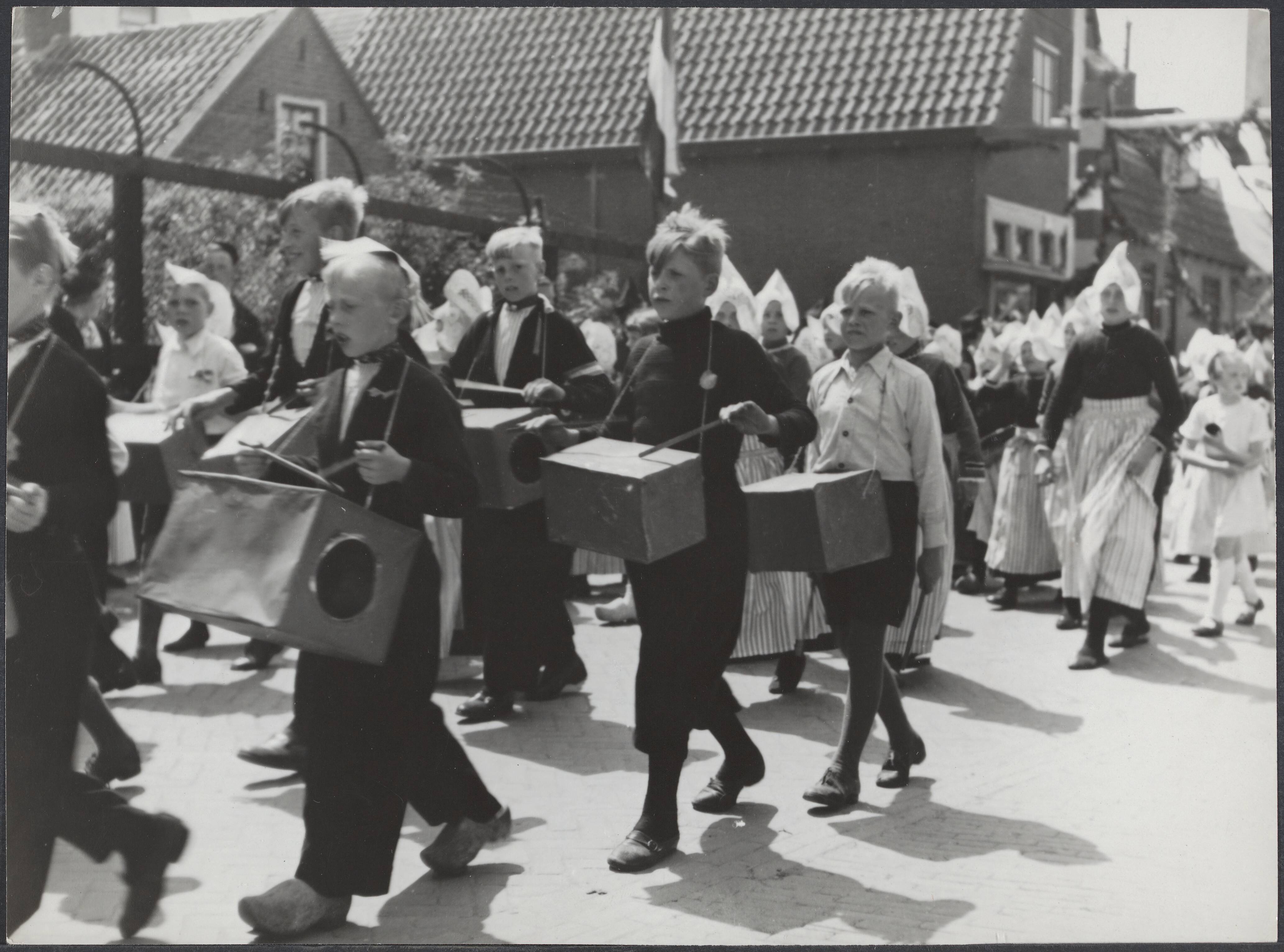 Feesten en kermis te Volendam, na de bevrijding. Kinderen trekken in optocht door de Volendamse straten met trommels van Engelse koekjesblikken