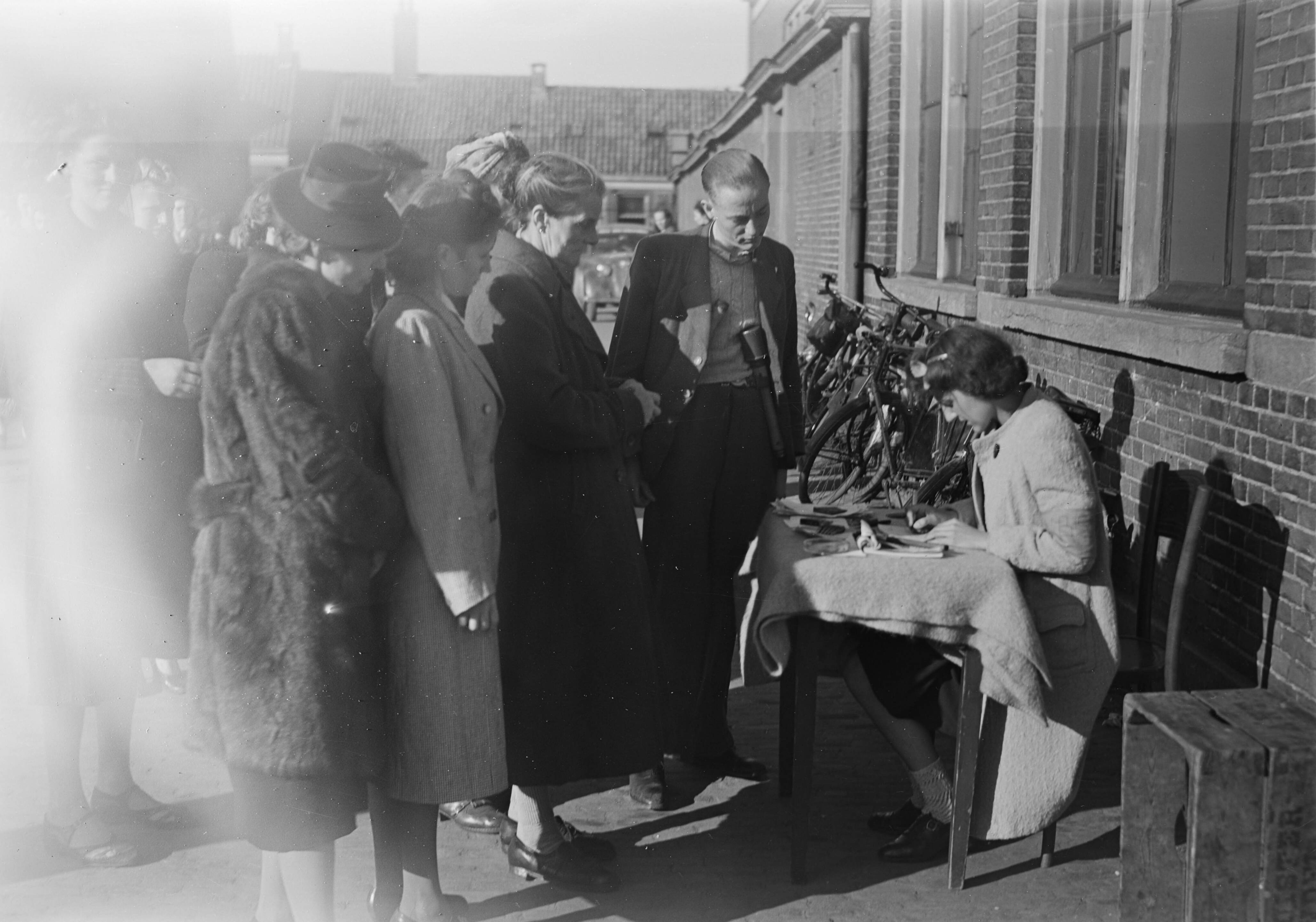 Vrouw achter tafel doet administratieve verrichtingen. Man naast haar heeft 2 Duitse handgranaten in zijn broekband. Links een aantal vrouwen.
