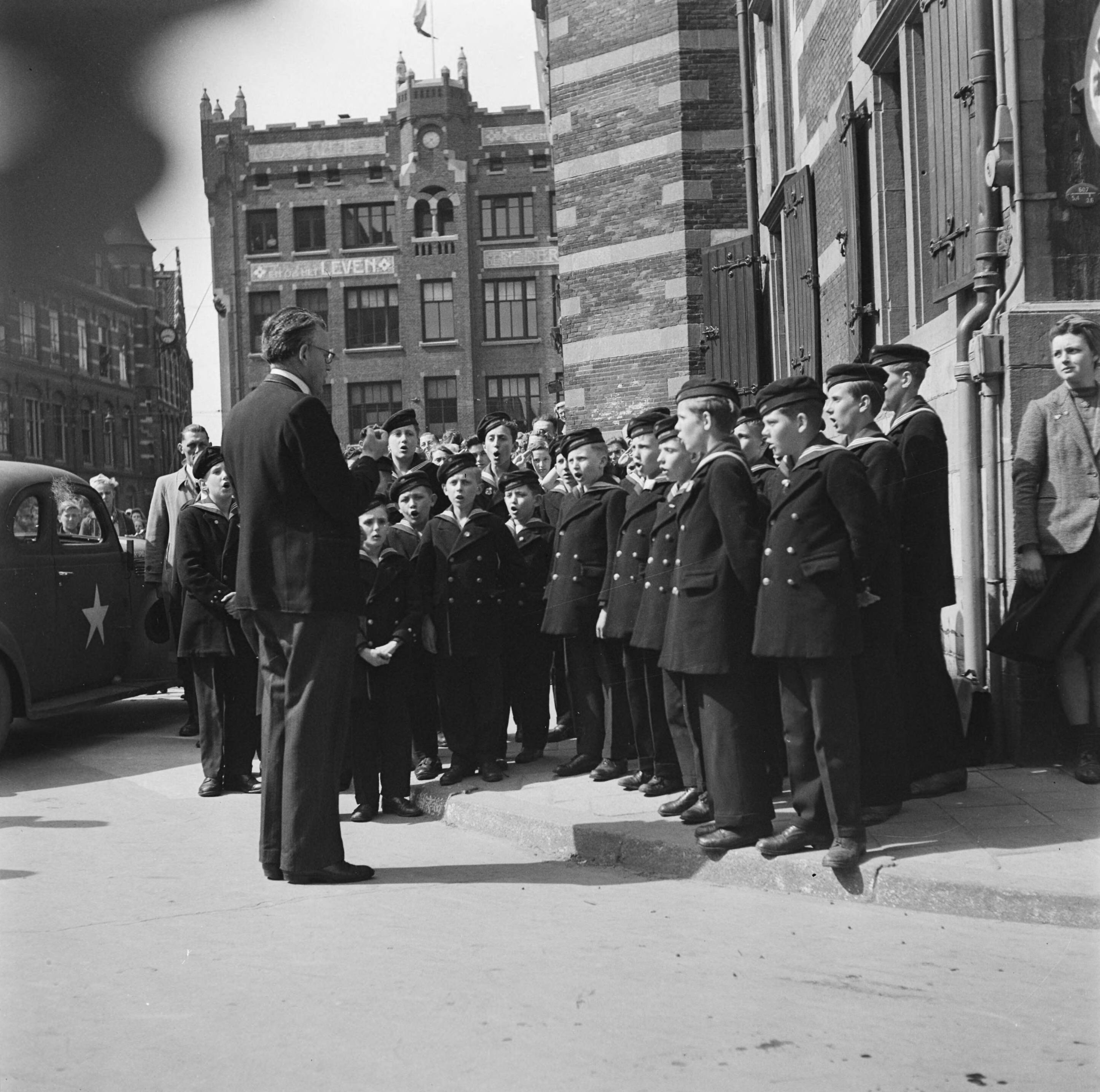 Bevrijding van Den Haag. Optreden van het Matrozenkoor voor het oude Stadhuis.