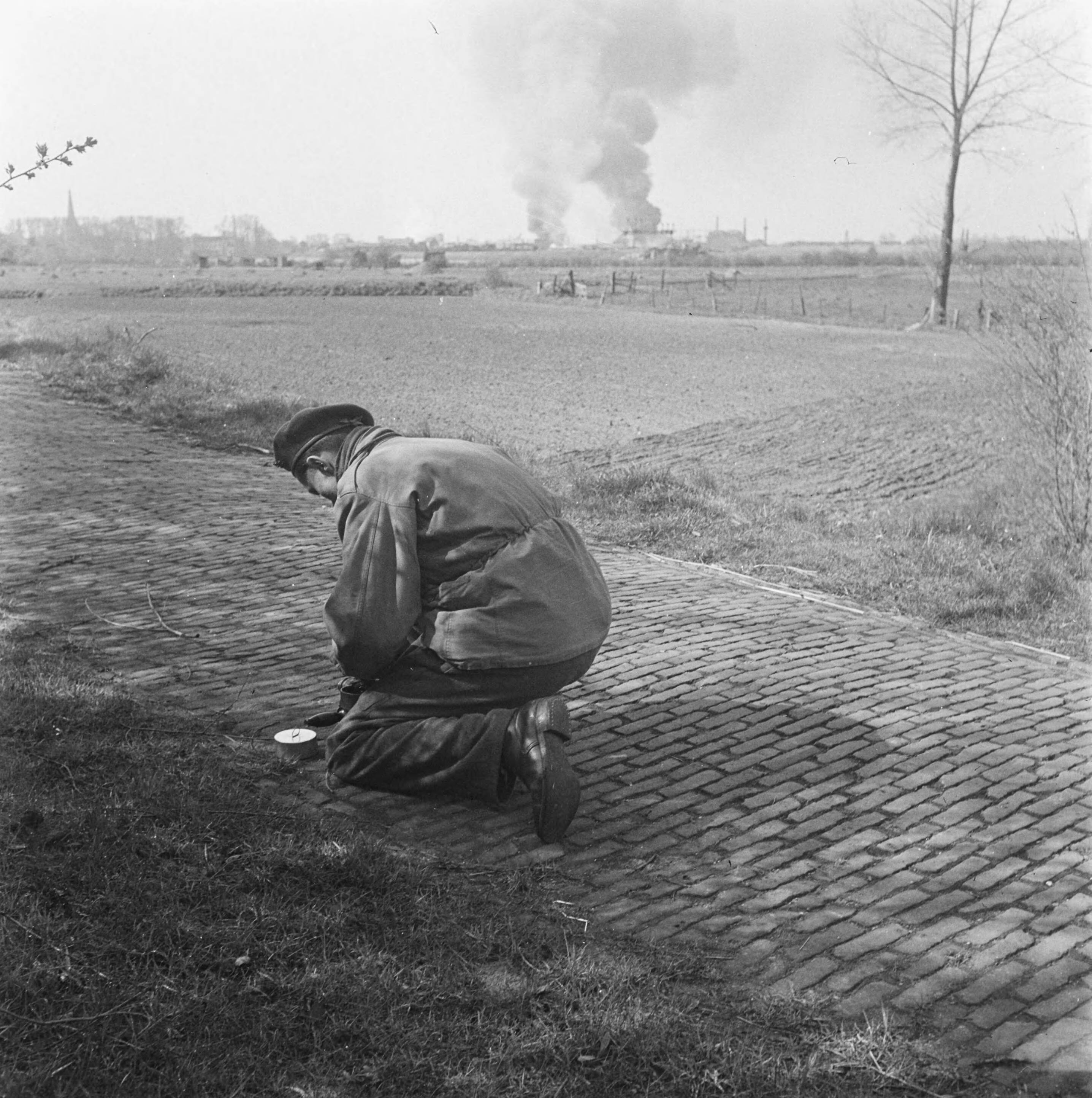 Installaties of fabrieken in brand gestoken door terugtrekkende Duitse troepen. Op de voorgrond een Candese pionier