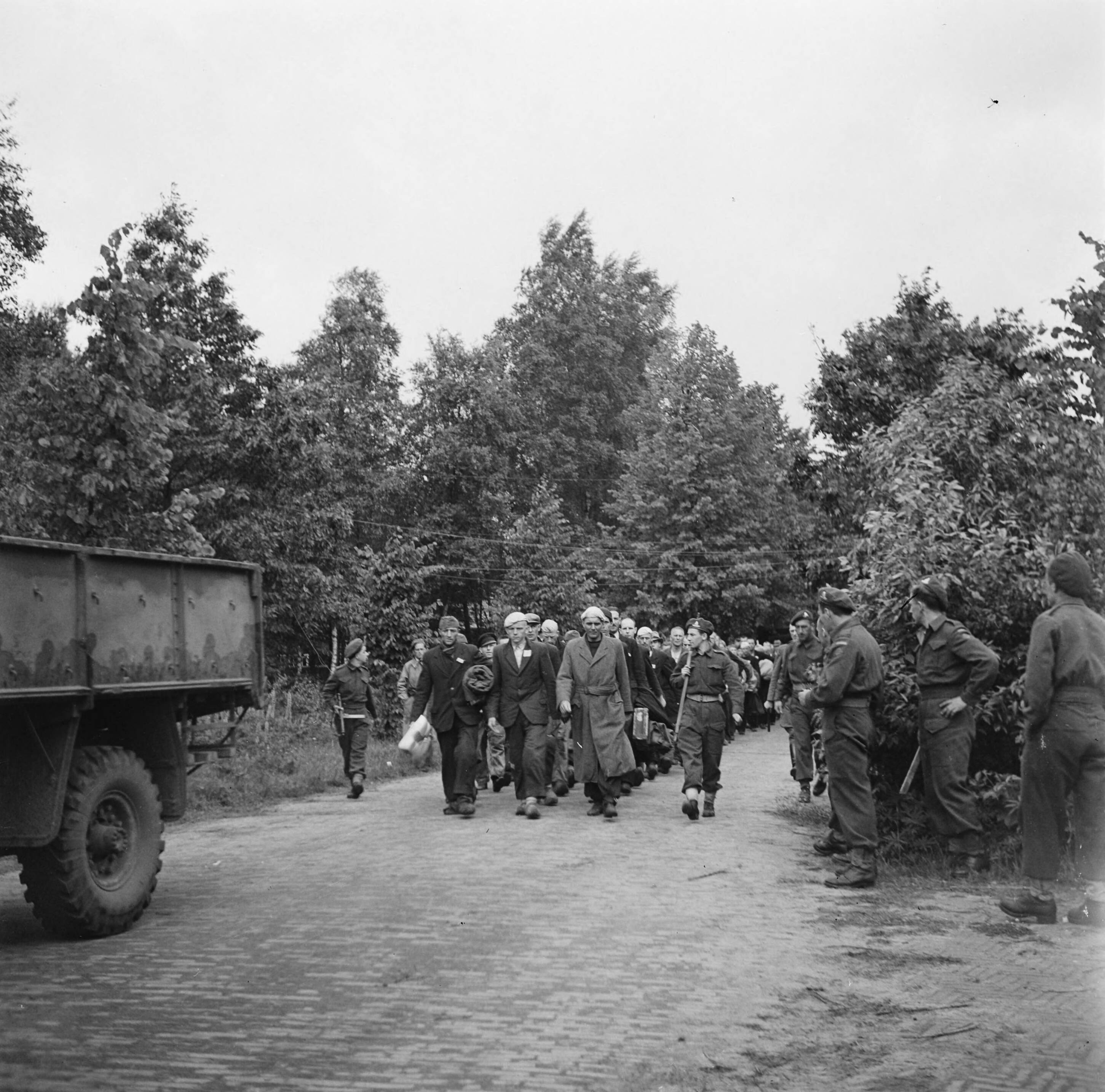 Krijgsgevangenen lopen onder begeleiding op een weg