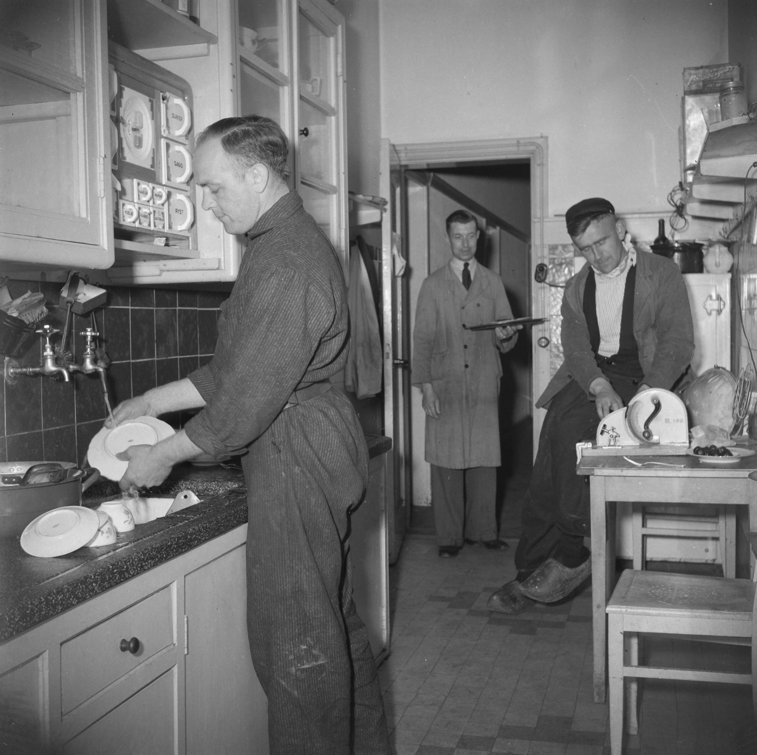 Serie over de hulp die de boeren van de Canadese troepen kregen. Mannen bezig met de afwas in een keuken