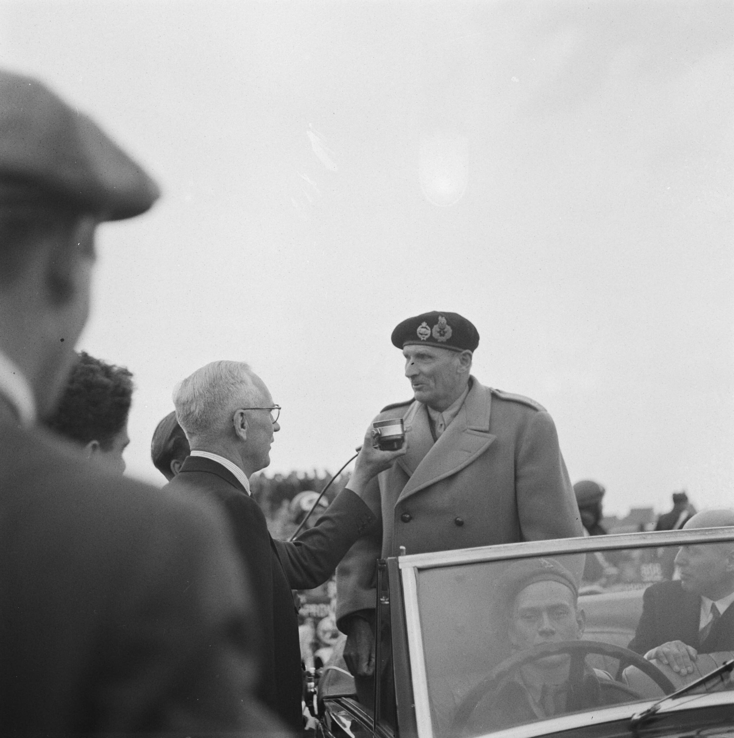 Veldmaarschalk Montgomery wordt geinterviewd door een radioverslaggever