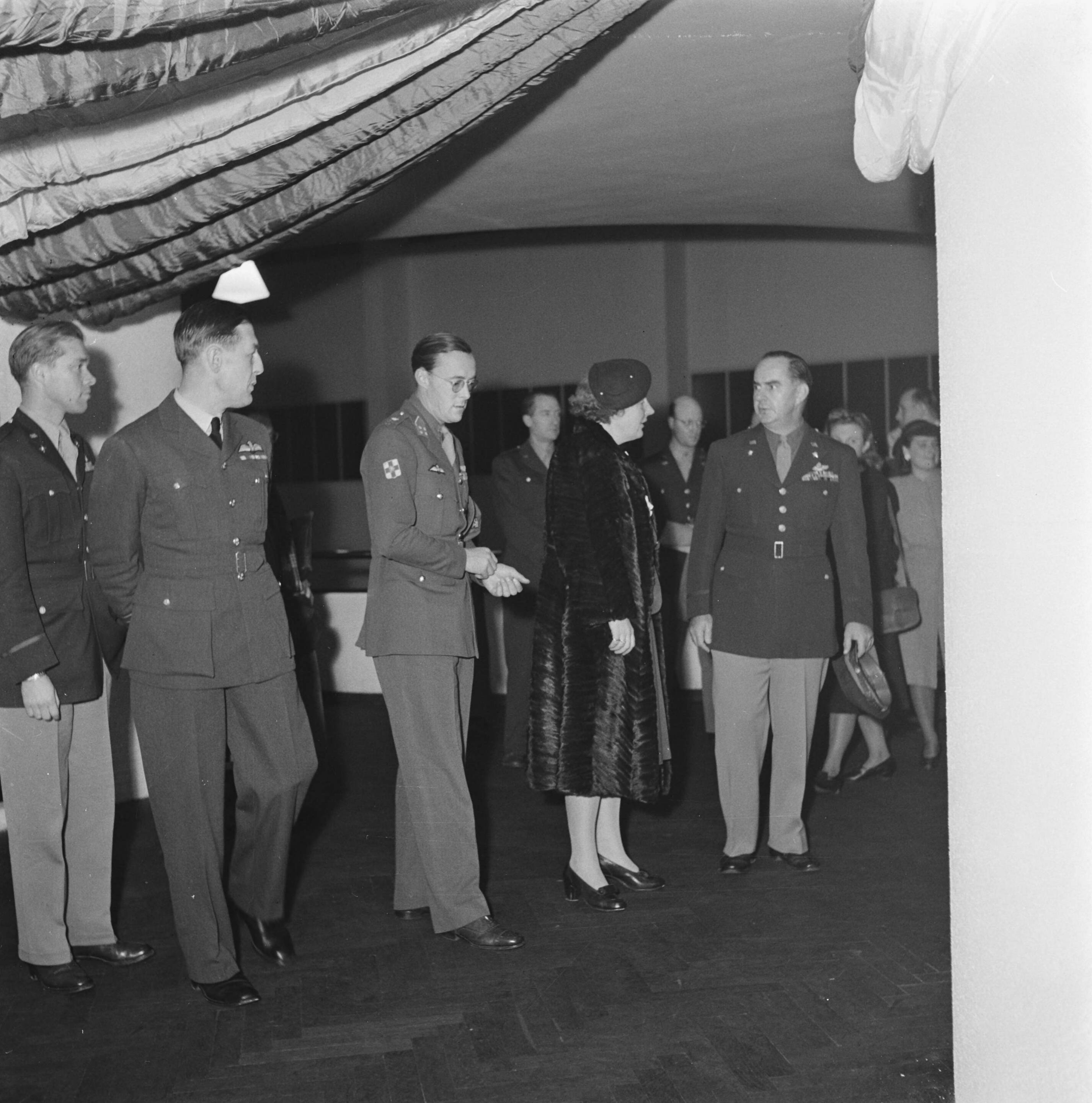 Openingsplechtigheid van de gemeenschappelijke R.A.F. — U.S.A.A.F-tentoonstelling in de Bijenkorf te Den Haag. Rondgang. Prinses Juliana en prins Bernhard. Links air chief marshall sir Sholto Douglas. Rechts de Amerikaanse luitenant-generaal John K. Cannon