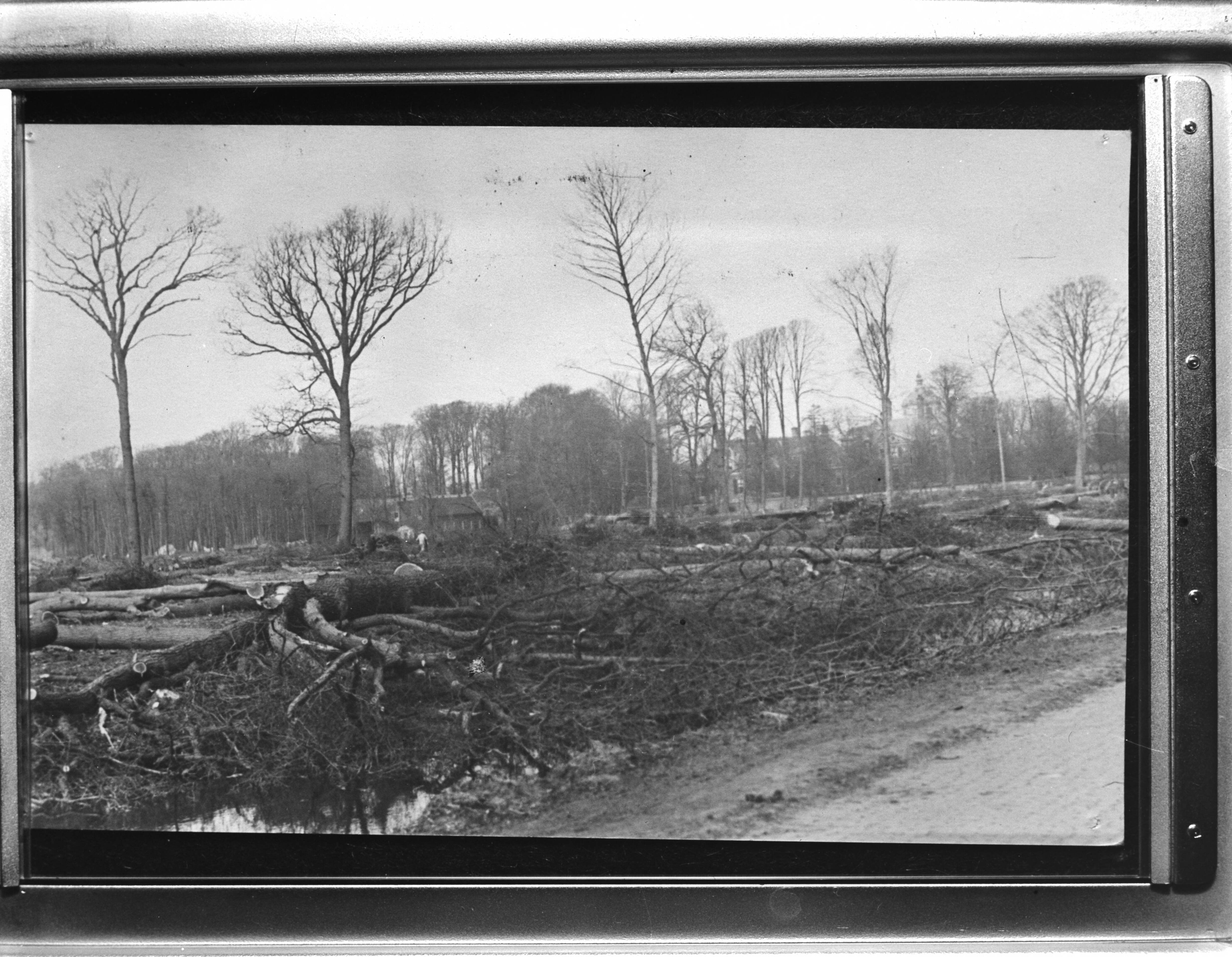 Den Haag. Afbraak voor bouw Atlantikwall. Bomenkap Haagse Bos vlakbij Huis ten Bosch