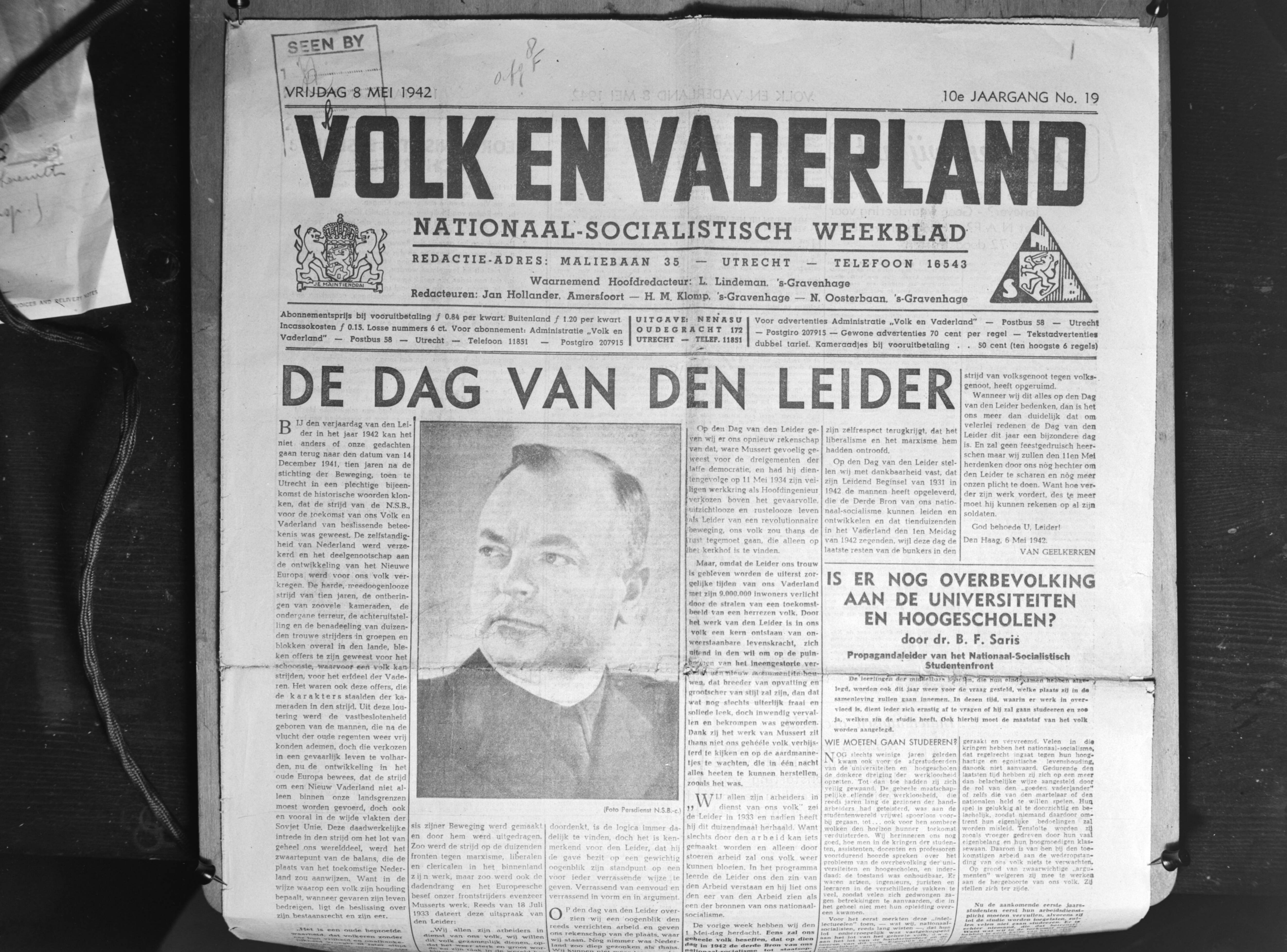Voorpagina Volk en Vaderland van vrijdag 8 mei 1942 (10e jaargang no. 19)