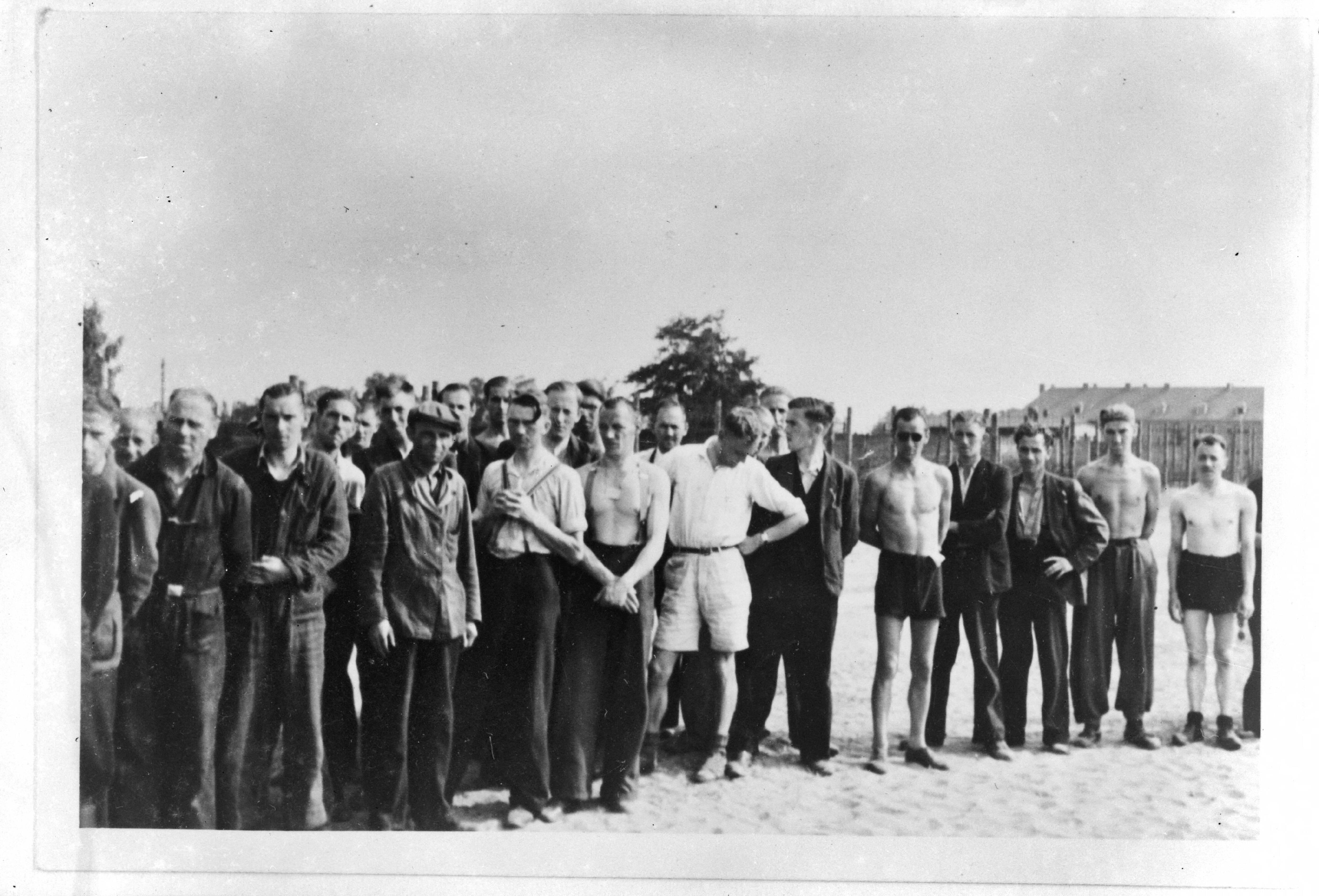 Een grote groep mannen staat aangetreden. Interneringskamp?