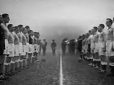 Voetbalwedstrijd Frankrijk tegen Nederland op Dulwich Hamlet Ground te Londen. De teams staan opgesteld, terwijl de volksliederen worden gespeeld. Rechts het Nederlandse team