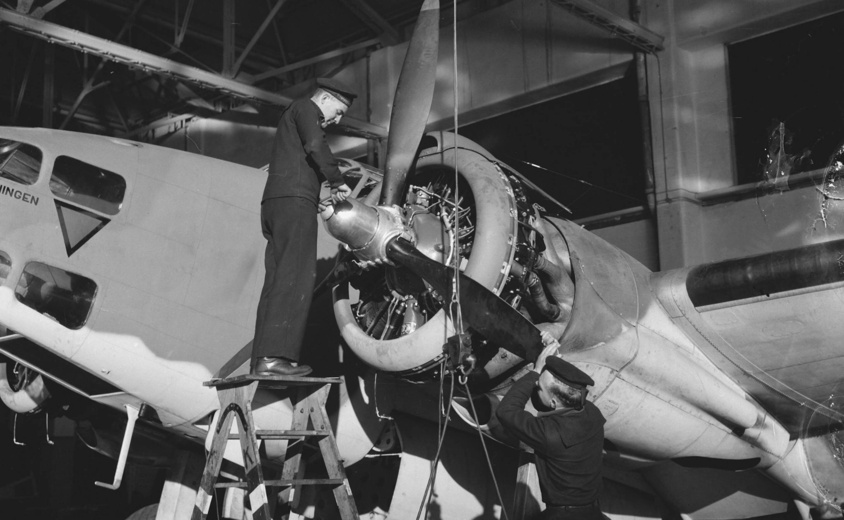 320 Squadron RAF Coastal Command, bemand door leden van de Marine Luchtvaart Dienst, gestationeerd op de RAF basis Lechars te Fife in Schotland, wordt gebruikt bij verkenningsvluchten, land-zee reddingswerk, convooiering en offensieve aanvallen over vijandelijk gebied periode oktober 1940 - december 1941. Lid van grondpersoneel bezig met onderhoud bommenwerper