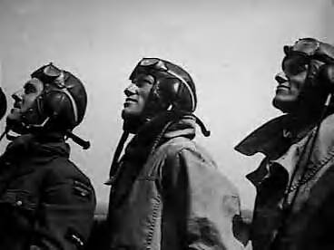 Jonge vliegers van de Nederlandse luchtmacht trainen op RAF-vliegveld Hullavington in Engeland. Van links naar rechts: persoon niet zichtbaar op scan J.L. Flinterman, A.H. van Rood, E.W. Ferwerda
