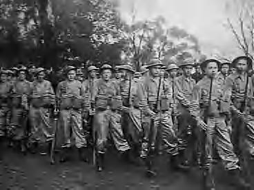 Meer dan 20.000 manschappen van de geallieerde strijdkrachten namen deel aan de Victory March door de straten van Melbourne, in de stromende regen, toegekeken door 300.000 mensen. KNIL-militairen bij het verzamelpunt in Alexandra Avenue voor het begin van de mars