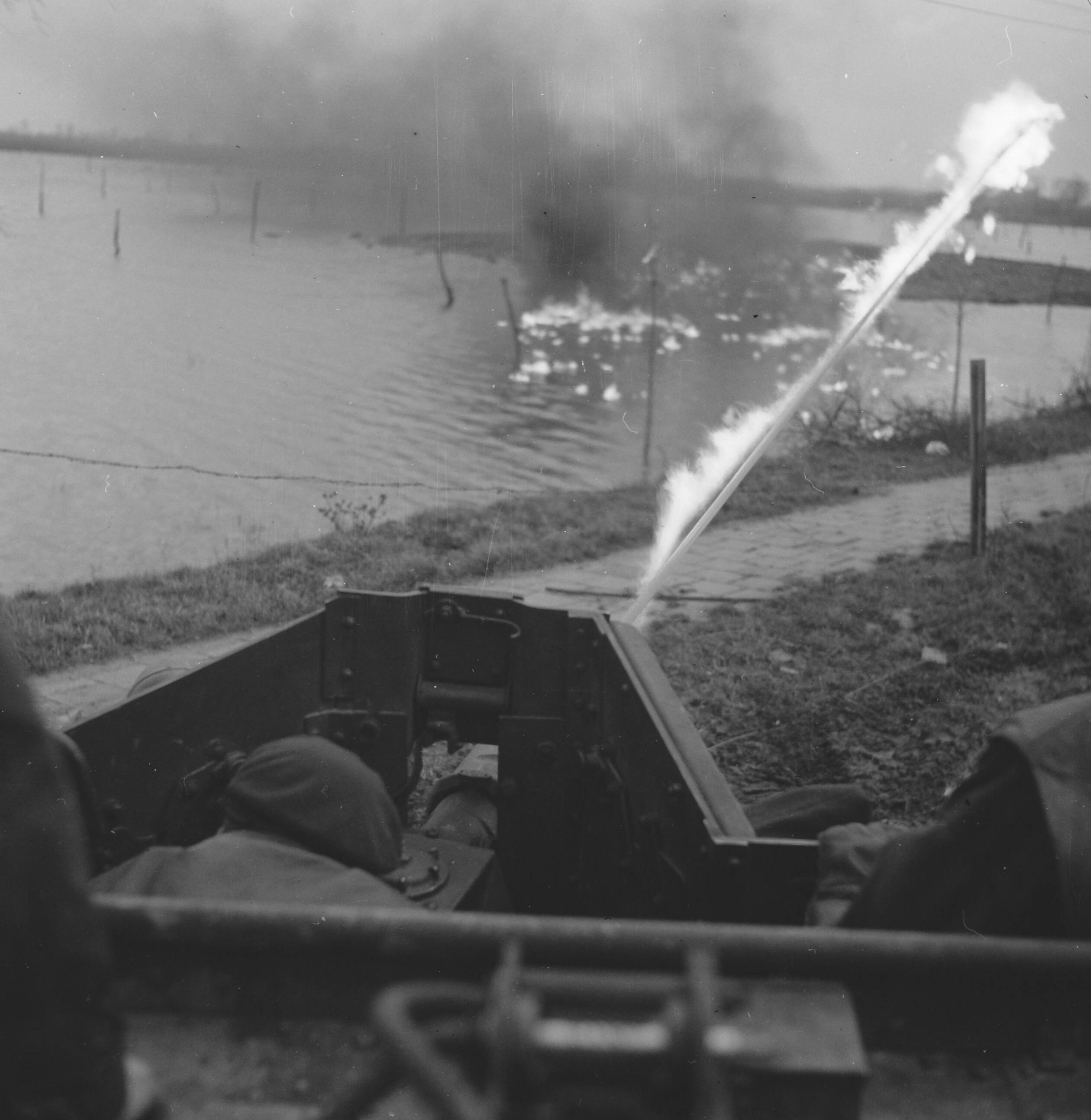 Prinses Irene Brigade neemt deel aan de bevrijding van Nederland. Nieuw wapen (vlammenwerper)