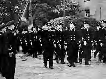 Adelborsten van de Koninklijke Marine voltooien hun opleiding tot marine-officier in Engeland. Zij marcheren langs het vaandel wat aan hen geschonken werd door koningin Wilhelmina, het enige wat gered kon worden uit Den Helder tijdens de Duitse aanval