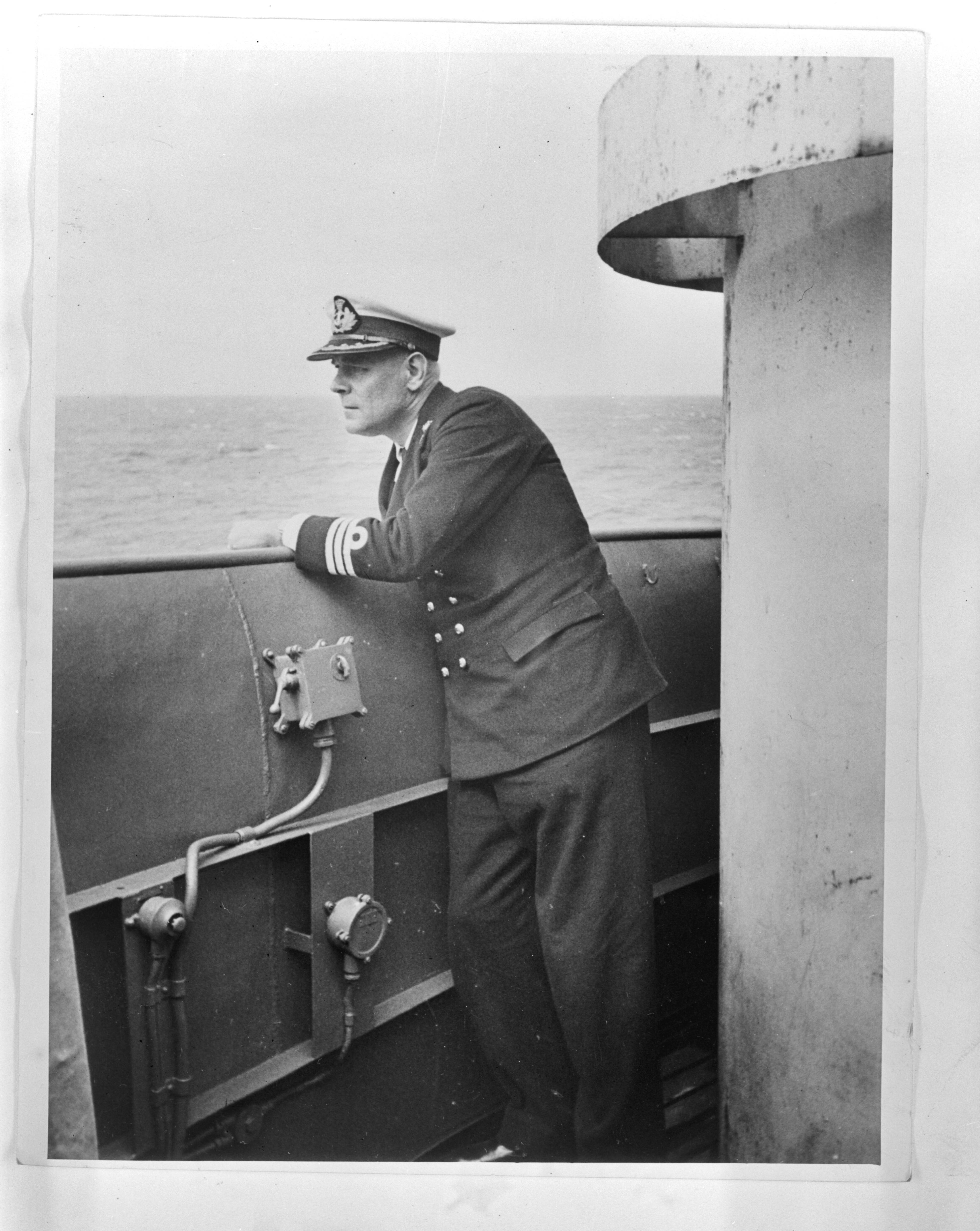 Aan boord van een Nederlandse kruiser in het zuidwesten van de Stille Oceaan. De commandant, kapitein-luitenant ter zee ? , op de brug.