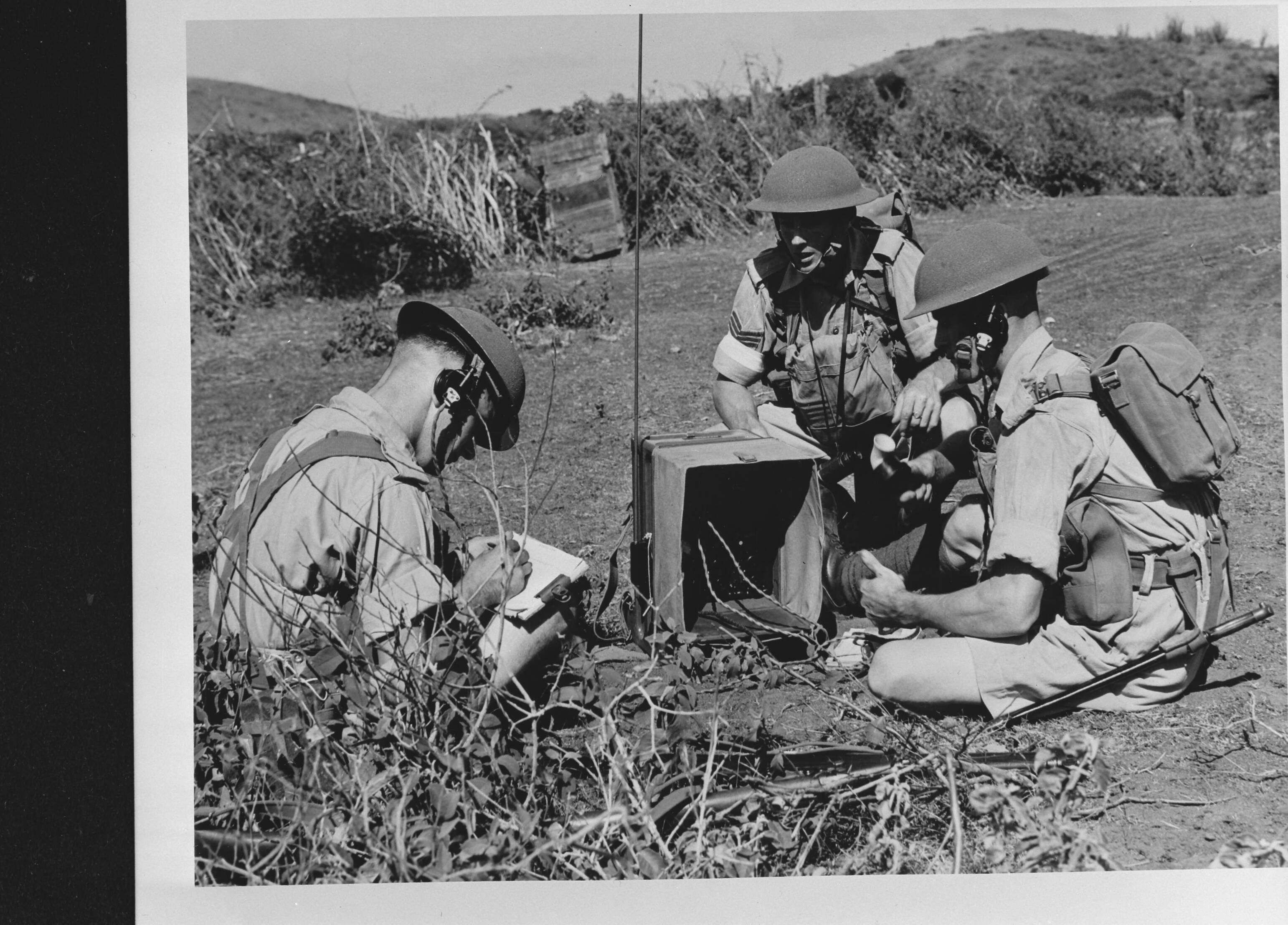 Curaçao. Het Engelse regiment de King's Shropshire Light Infantry tijdens oefeningen bij Suffisant. Oefenen met radio-verbindingen
