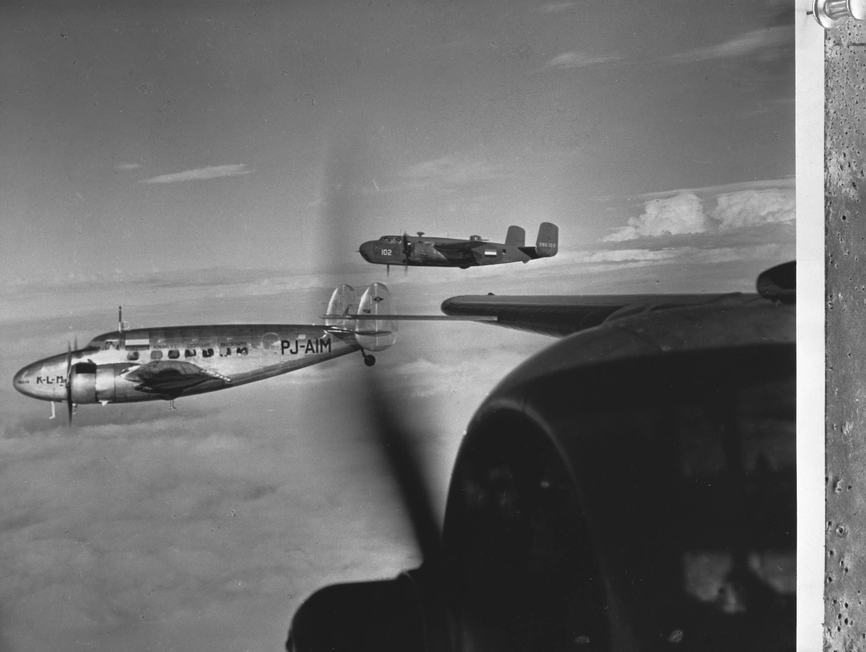 Bezoek van prinses Juliana aan Suriname (1943) . De vliegtuigen onderweg Prinses Juliana bezocht Suriname en landde daar in november 1943 per vliegtuig. Op haar weg naar Suriname vloog ze over de Bovenwindse Eilanden en werden er pamfletten uitgestrooid, waarin ze de bewoners groette en haar spijt betuigde dat het voor haar niet mogelijk was hen te bezoeken. Op de foto het KLM vliegtuig en twee Amerikaanse gevechtsvliegtuigen als begeleiding