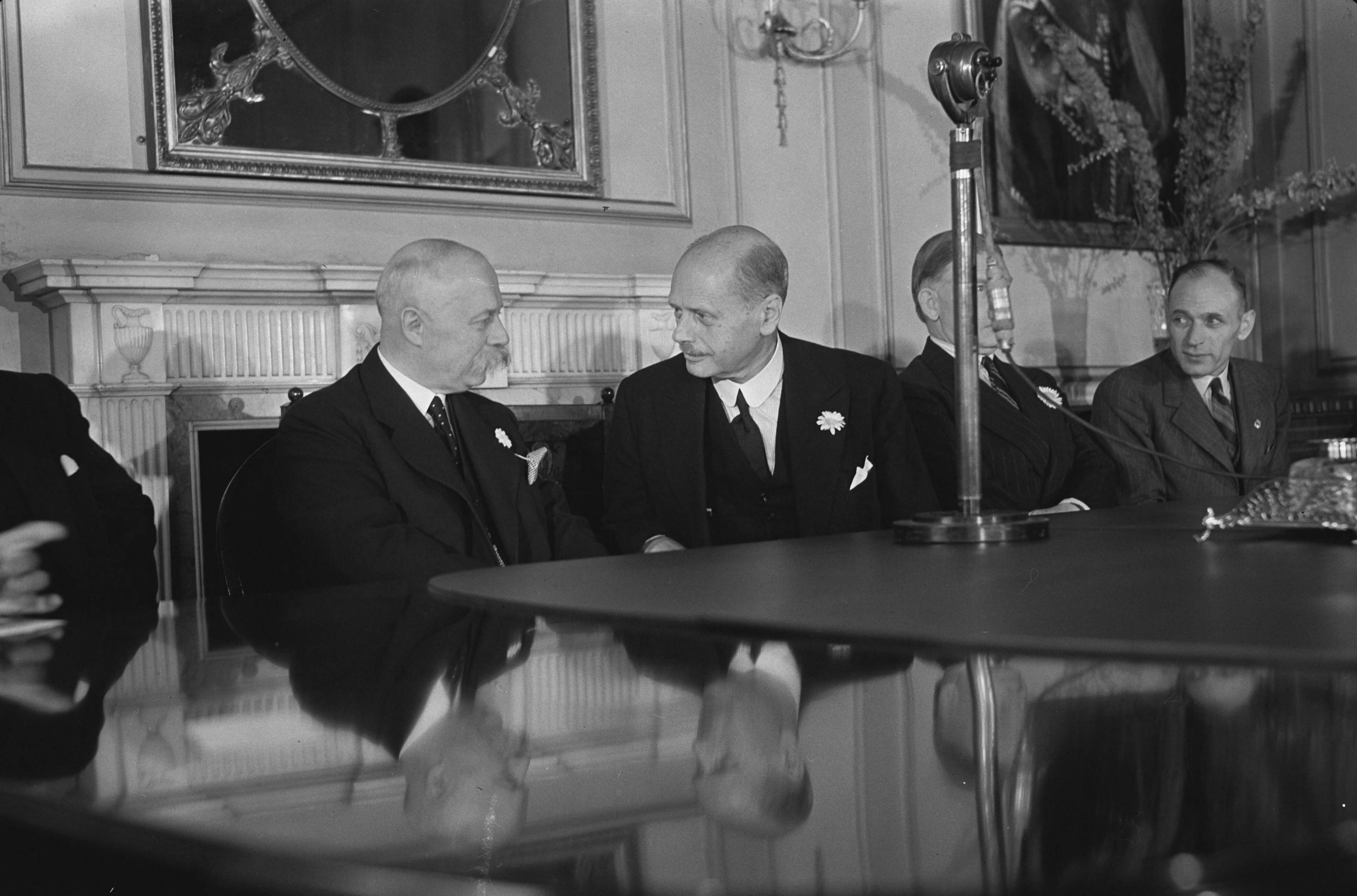 Buitengewone Raad van Advies wordt in London geinaugureerd. Minister-president Gerbrandy en jhr. F. Beelaerts van Blokland.