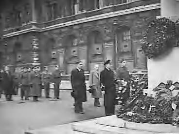 Kranslegging bij de Cenotaph in Whitehall (Londen) door een Belgisch en een Nederlands voetbalteam die een wedstrijd zullen spelen te Brentford. De aanvoerders, W. v.d. Oever (Nederland) en korporaal R. Billiet (België) plaatsen de kransen