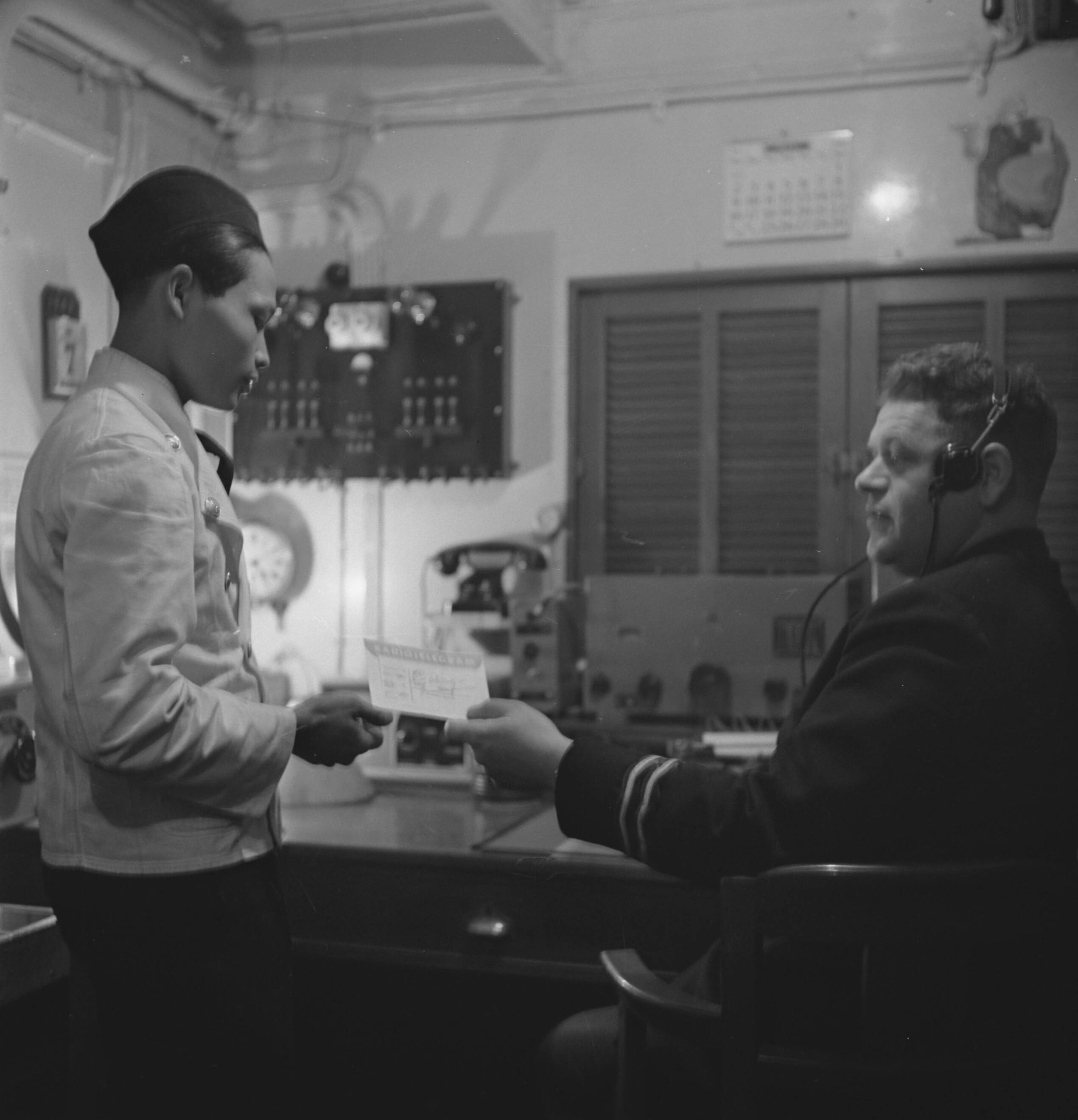 Bijschrift: "On "Sparks" many lives may depend. Wireless operator on converted Dutch luxury liner" Marconist op een omgebouwd luxe passagiersschip overhandigt een bericht aan een Indische bediende