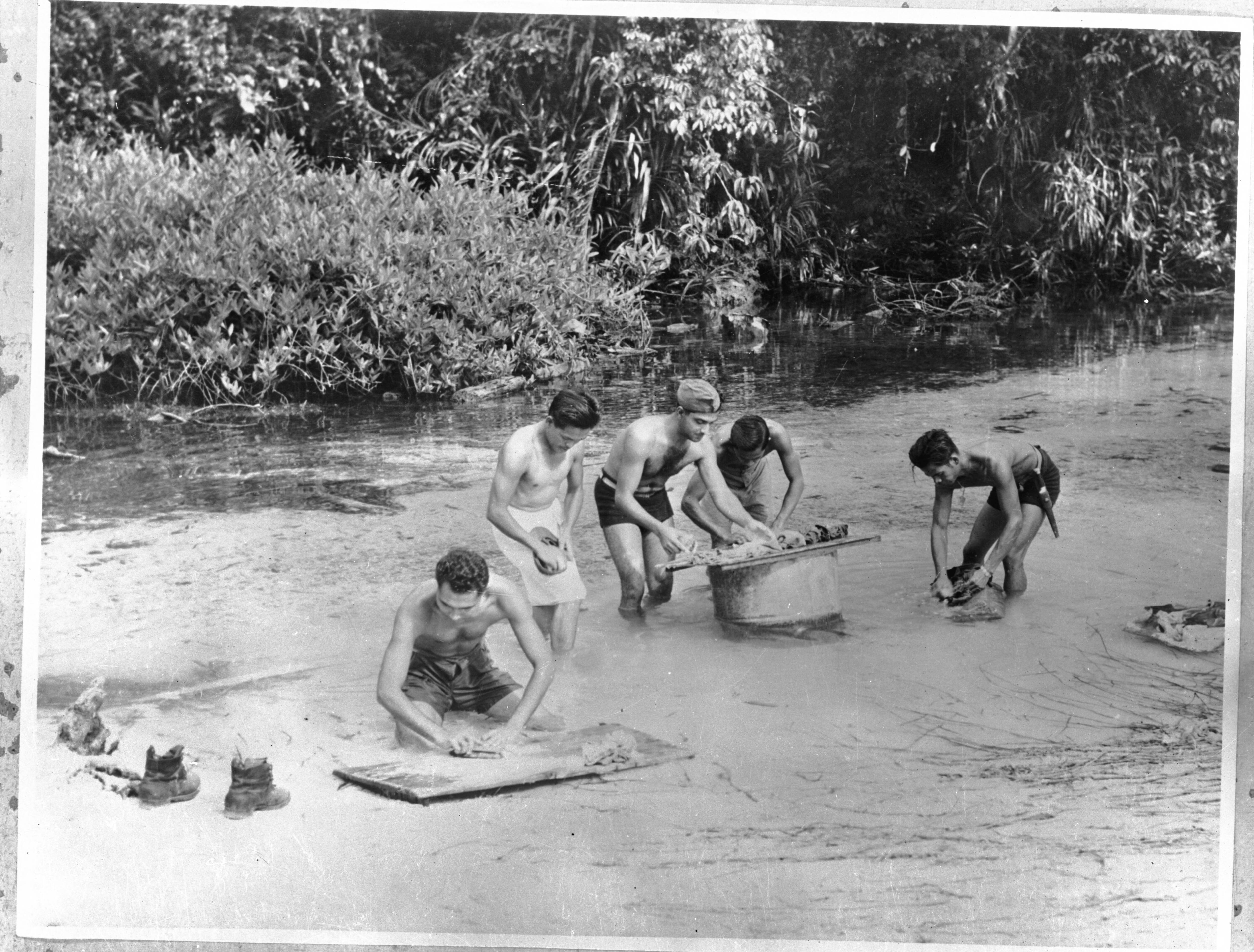 Manschappen wassen hun kleren en schoeisel in een beek