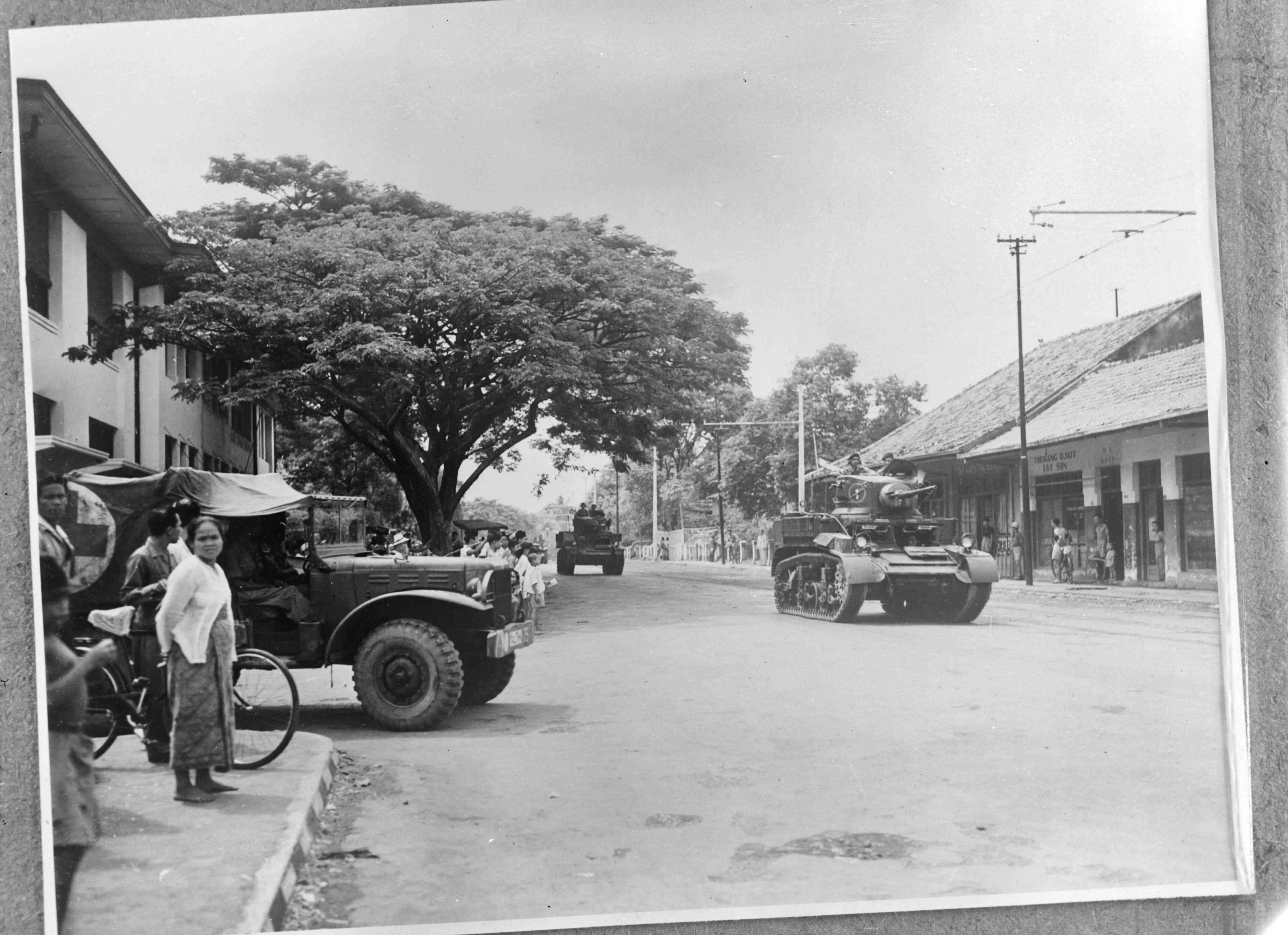 Batavia. Britse Stuart-tanks rijden door de straat