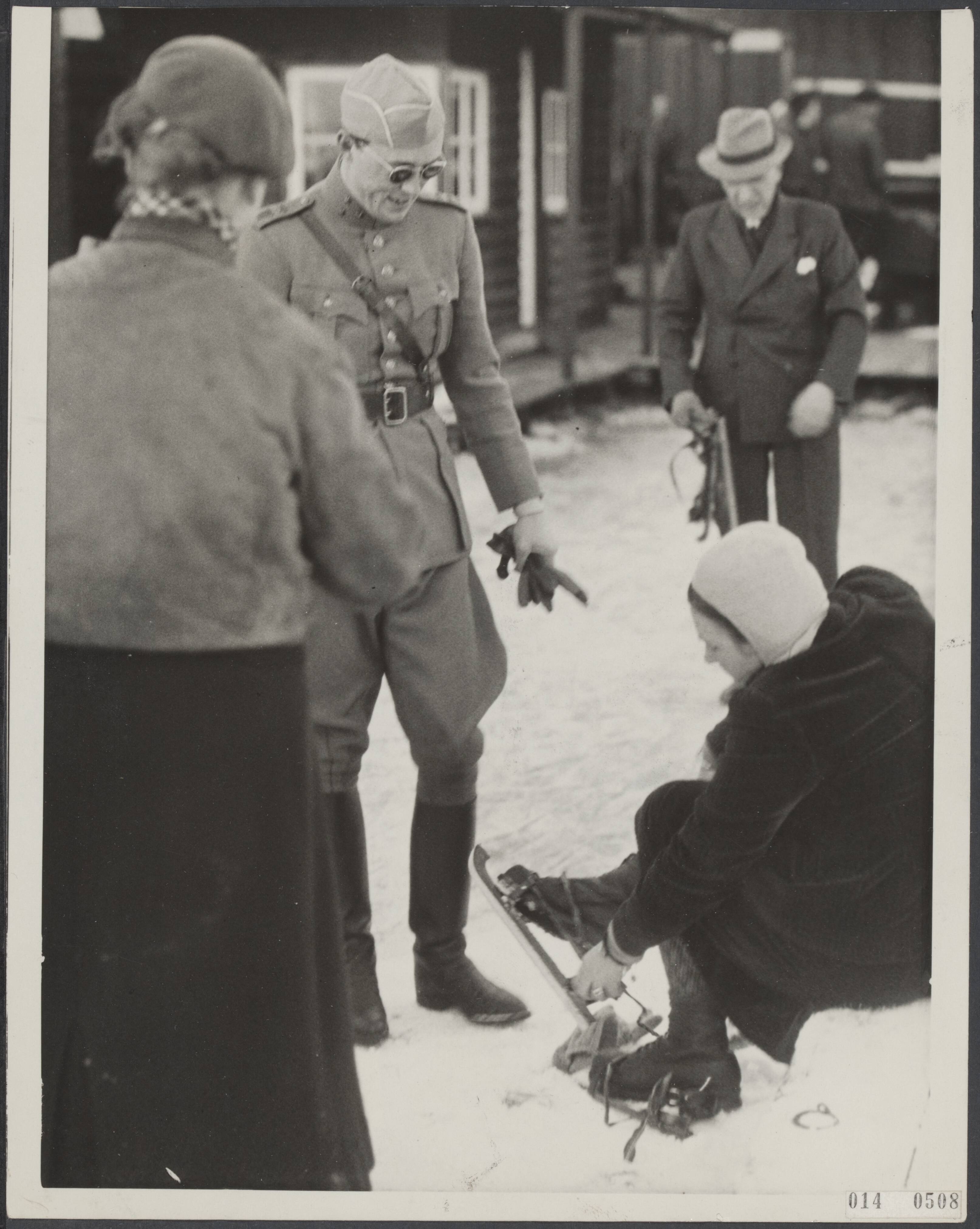 Prinses Juliana op de Loosdrechtse Plassen. Samen met prins Bernhard en een klein gezelschap heeft zij daar schaats gereden. Na de plassen enige malen te hebben rondgereden bindt de prinses haar schaatsen af