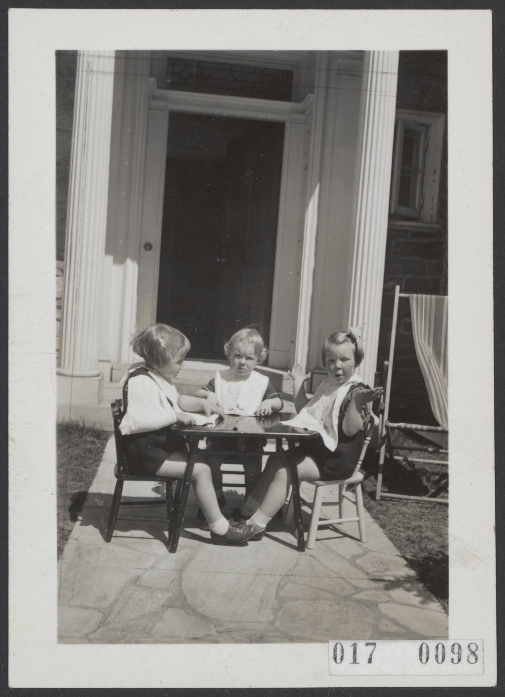 Prinses Beatrix (rechts) met prinses Irene (midden) en Renee Roëll (links) zitten met slabbetjes om, buiten aan een een kleine eet...