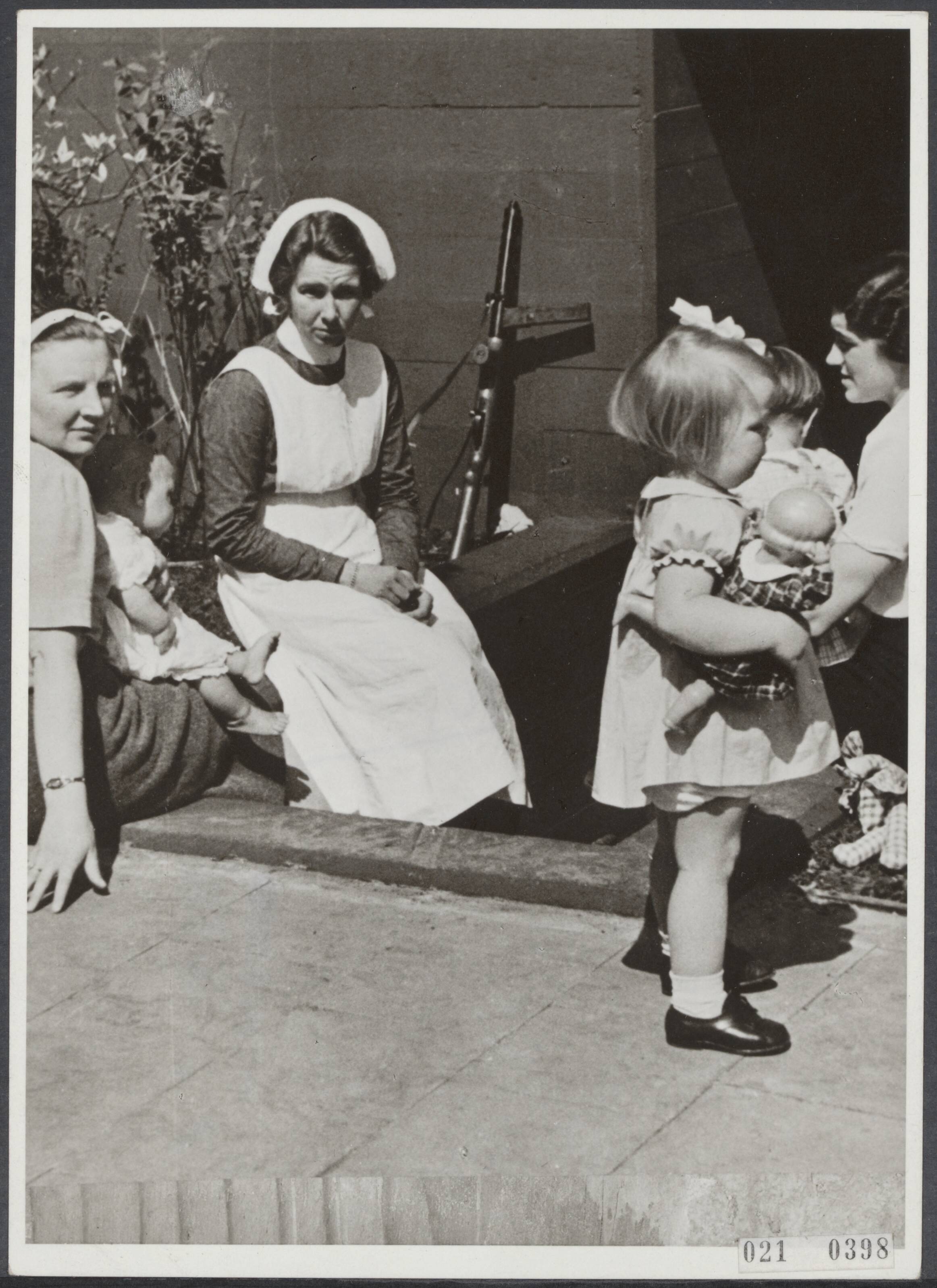 Koningin Juliana met op schoot prinses Irene, en prinses Beatrix (staand rechts) met verpleegster bij schuilkelder bij paleis Noordeinde in Den Haag tijdens de meidagen '40