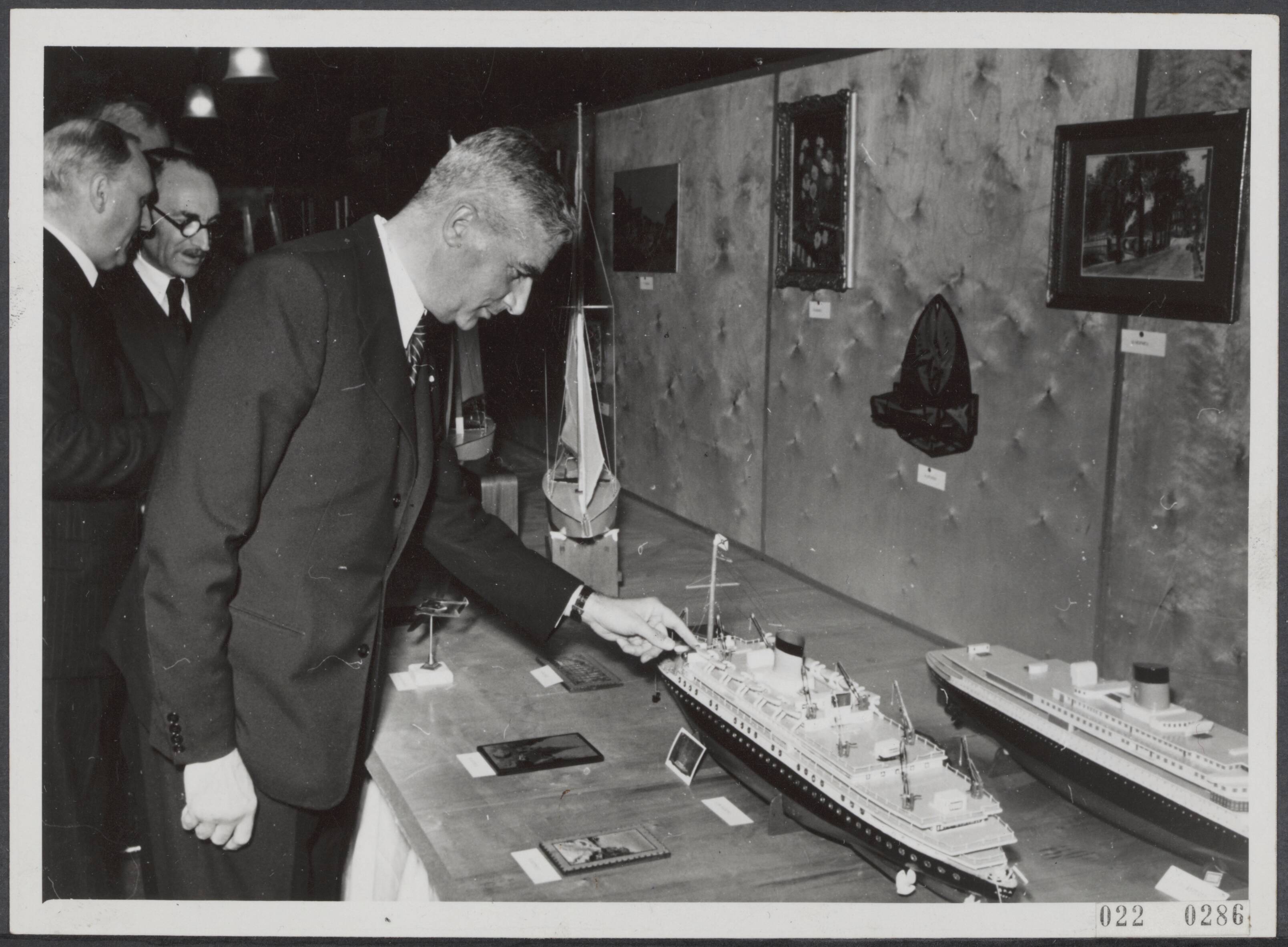 Burgemeester Voûte op de tentoonstelling van werkstukken en producten van huisvlijt, vevaardigd door leden van de Gemeentelijke Luchtbeschermingsdienst van Amsterdam