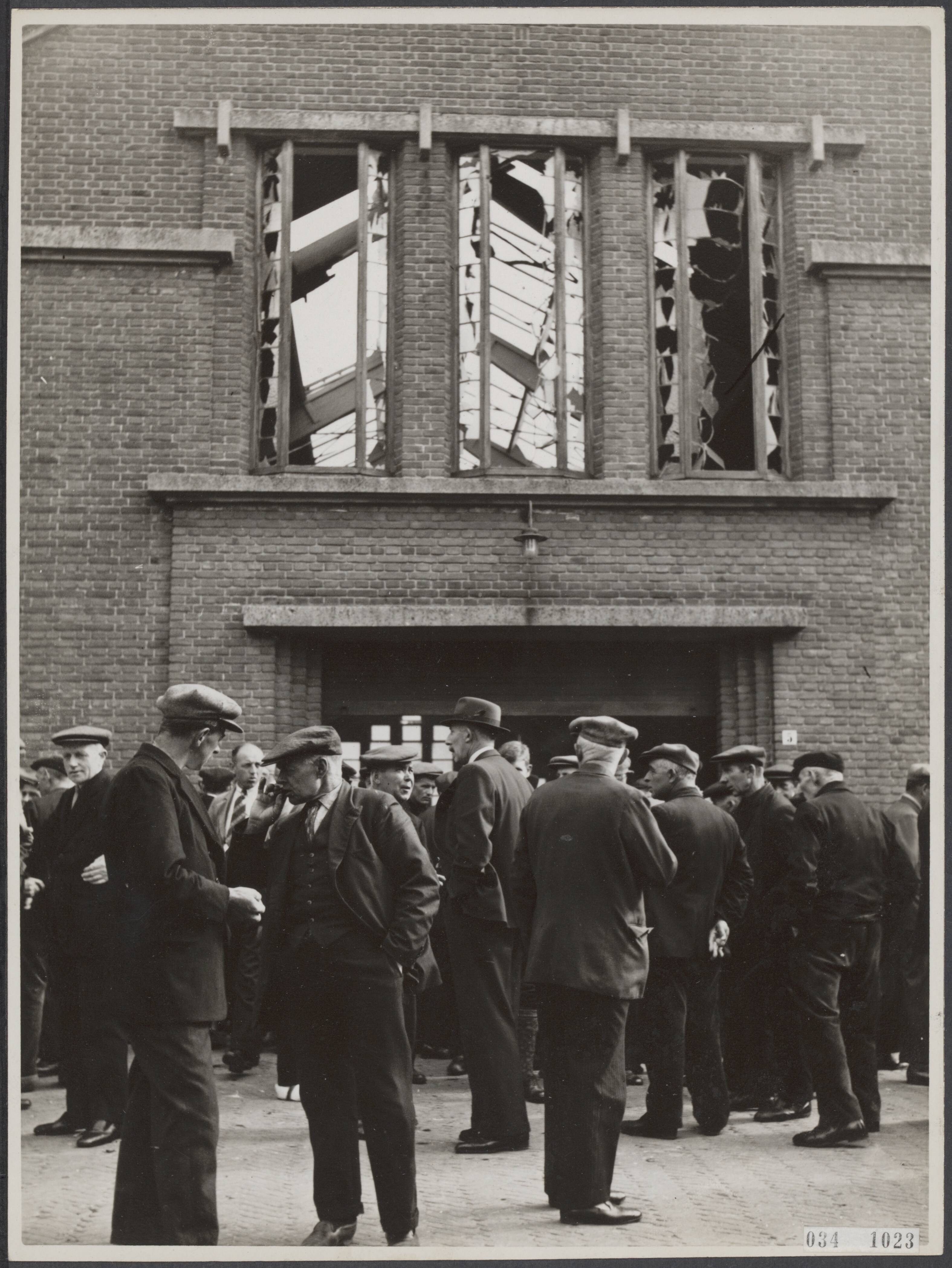 Besprekingen voor de nieuwe hal waarvan de ruiten kapot zijn, het gaat hier waarchijnlijk om de oude hal die tijdens oorlogshandel...