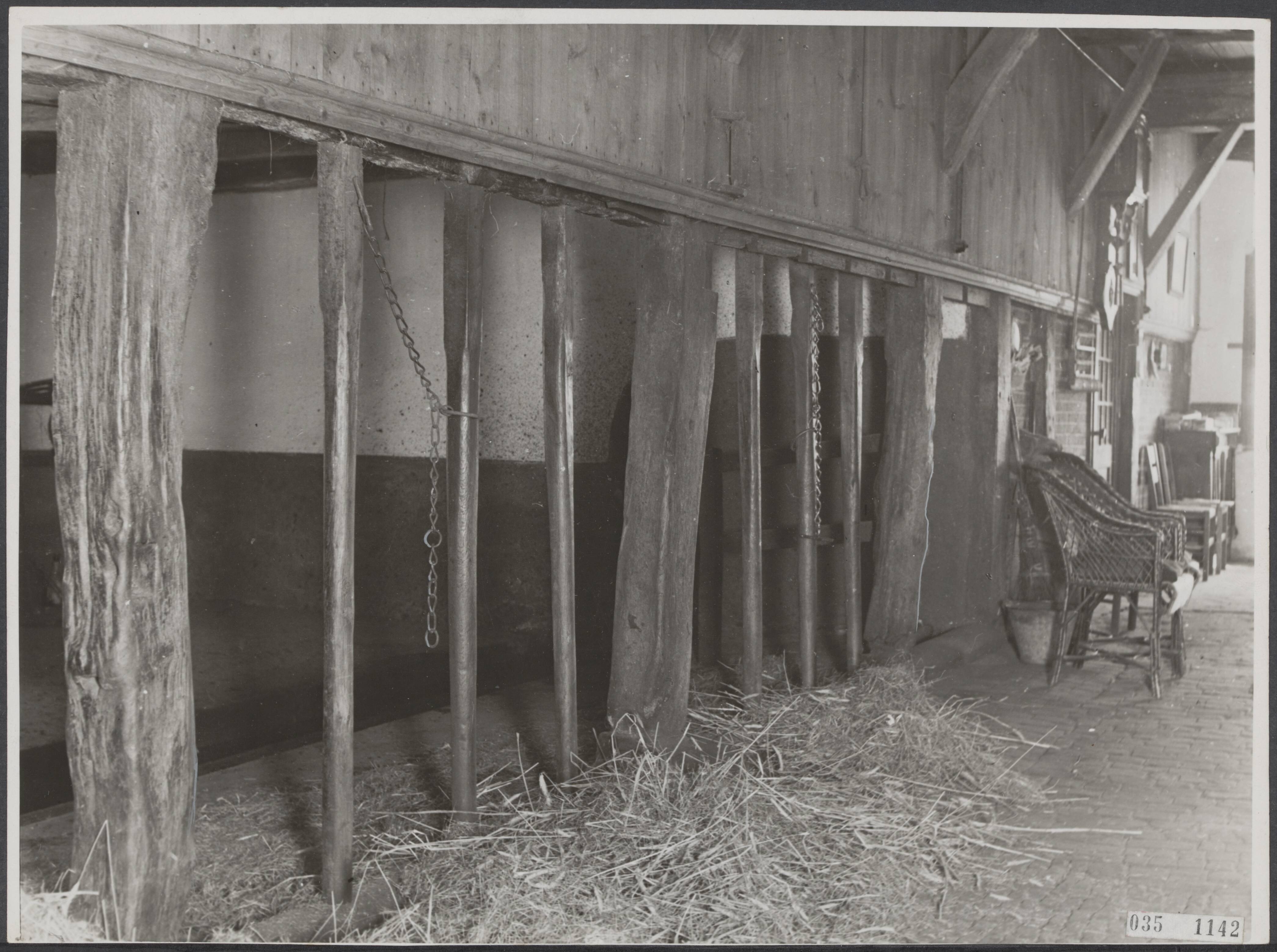 serie: Twente. Het verdwijnende "Losse Hoes". Oud Saksische Boerderij Aan deze houten palen, "reppels" genaamd, werden de koeien in de deel van het Los Hoes met kettingen vastgemaakt.