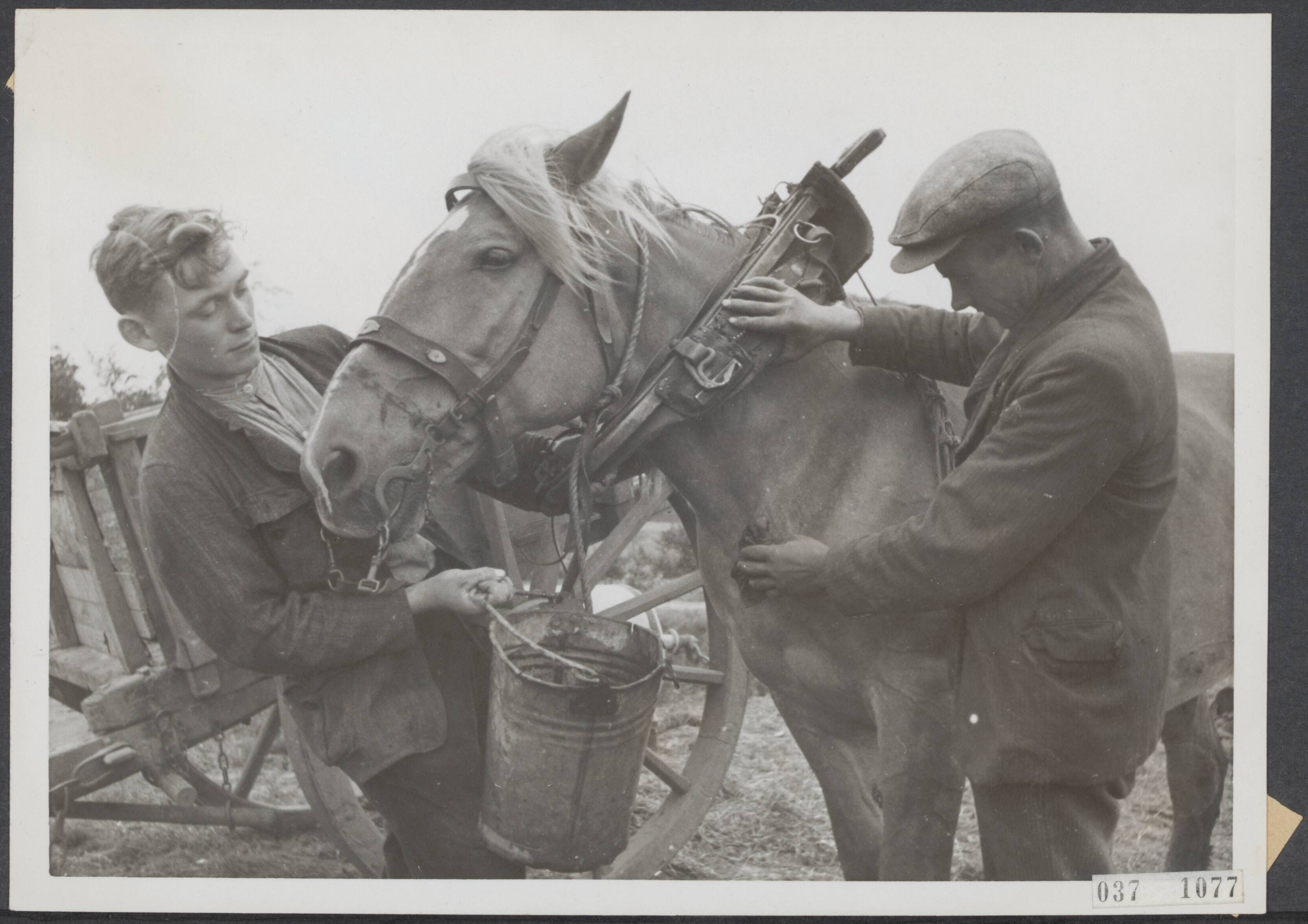 Serie "Verzorging van het paard". Zorg voor uw Paard. Onder deze titel doet de Nederlandsche Vereeniging tot Bescherming van Dieren een beroep op allen, die thans gebruik maken van de goede diensten der edele viervoeters, nu de motor voor velerlei transport is uitgeschakeld. nr. 278. Telkens na gebruik van het paard, vooral als het dier zwaar werk heeft verricht, wasse men de plaatsen, waar het haam, gareel of de borstriem heeft gedrukt, met lauw water af en wrijve deze goed droog