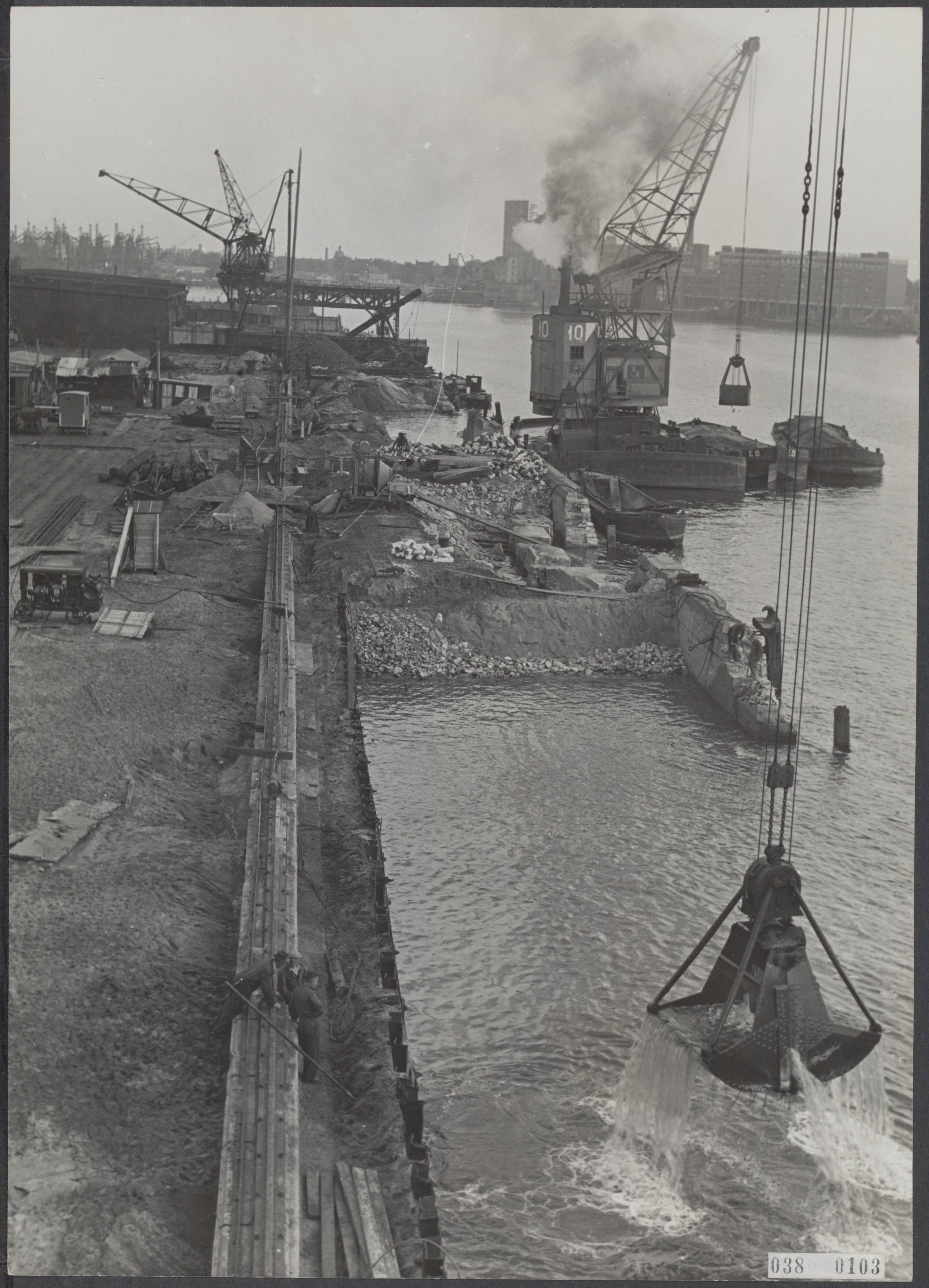 Herstelwerkzaamheden aan de verwoeste kademuren van Rotterdam