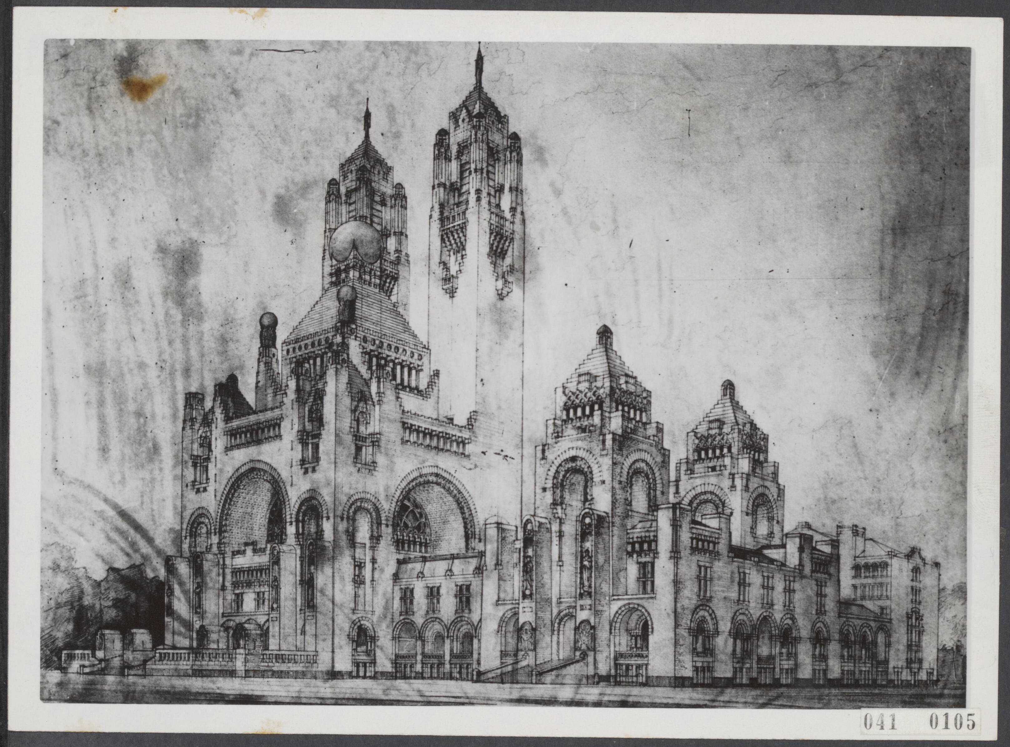 Brits bombardement op Rotterdam in de nacht van 3 op 4 oktober, waarbij ook museum Boijmans gedeeltelijk verwoest werd. Een fotokopie van de door brandbommen vernietigde tekening van een ontwerp voor het Vredespaleis uit 1906