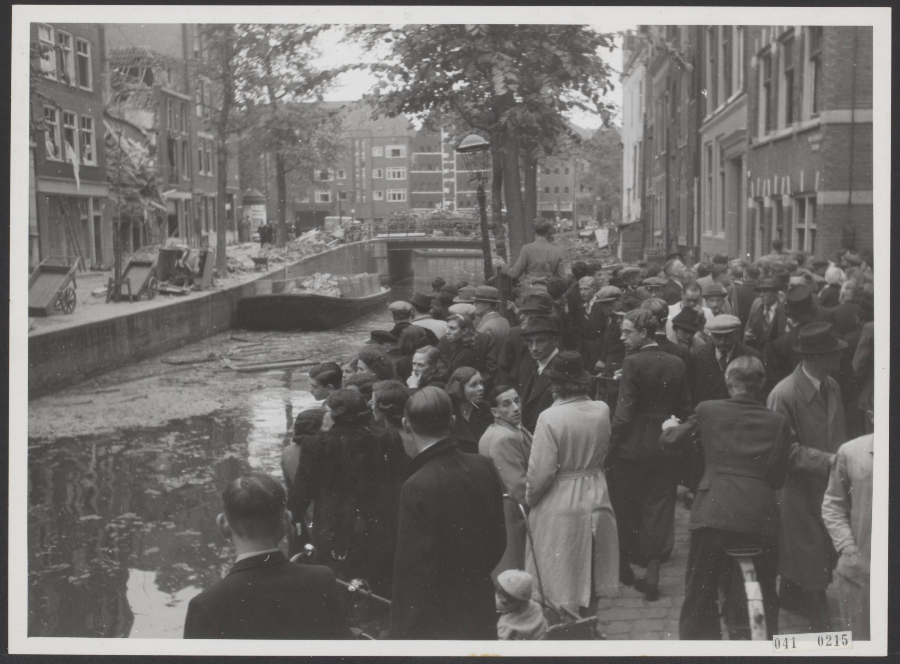 Geallieerd bombardement op de Rechtboomsloot te Amsterdam. Burgers bekijken de schade