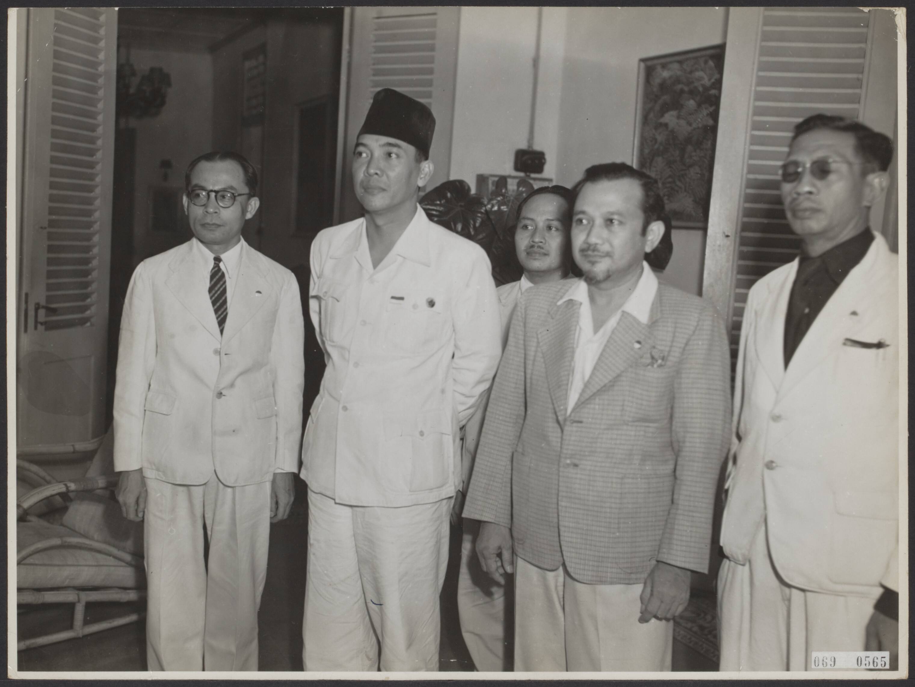 Leden van het Indonesisch Presidentieel Kabinet (?); Vlnr. Mohammed Hatta, Soekarno, Abdul Gaffar Pringgodigdo, Achmad Soebardjo en Abikusno Cokrosuyono