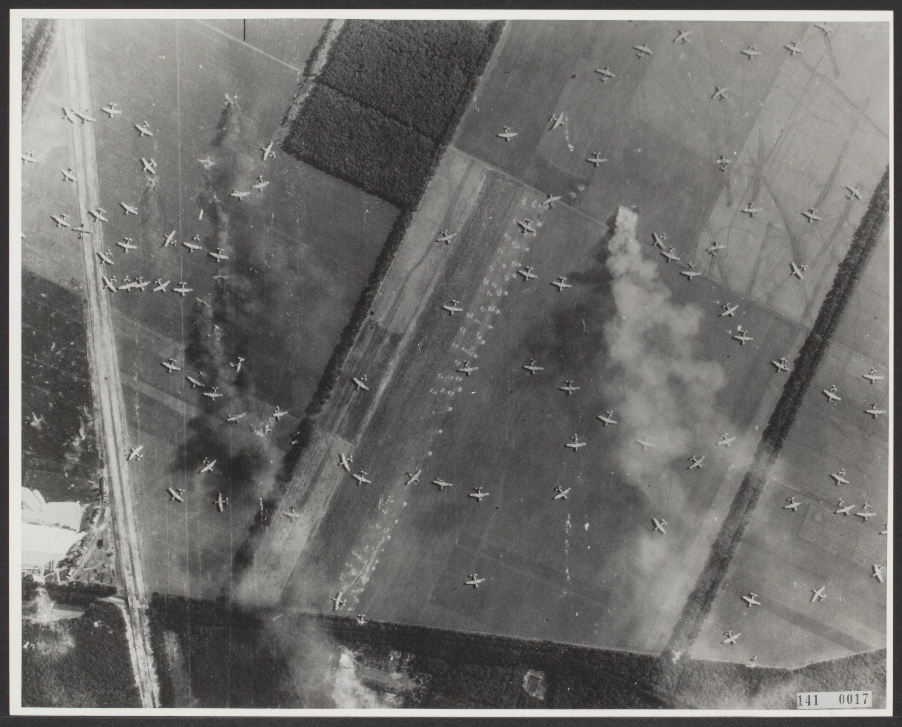 Luchtopname Operatie Market Garden = Slag om Arnhem. Britse zweefvliegtuigen op de Ginkelse Heide tussen Ede en Wolfheze. Enkele toestellen staan in brand na Duitse beschietingen. De witte streep is het tracé van de autosnelweg Arnhem-Utrecht