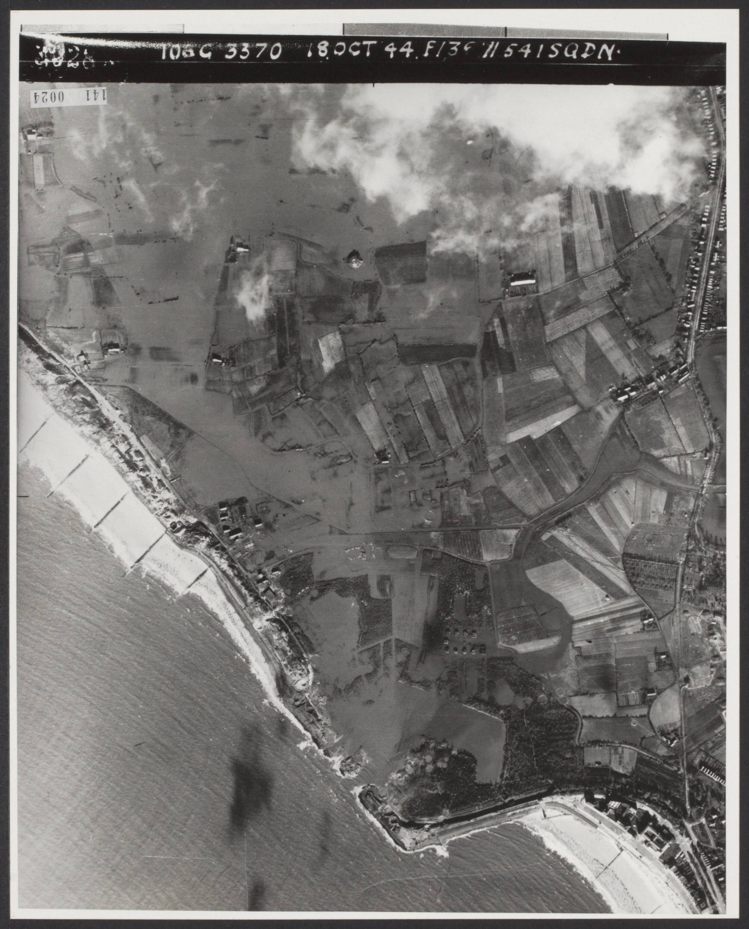 Luchtopname. De op 7 oktober 1944 door de geallieerden gebombardeerde dijk bij het Nollebos ten noordwesten van Vlissingen
