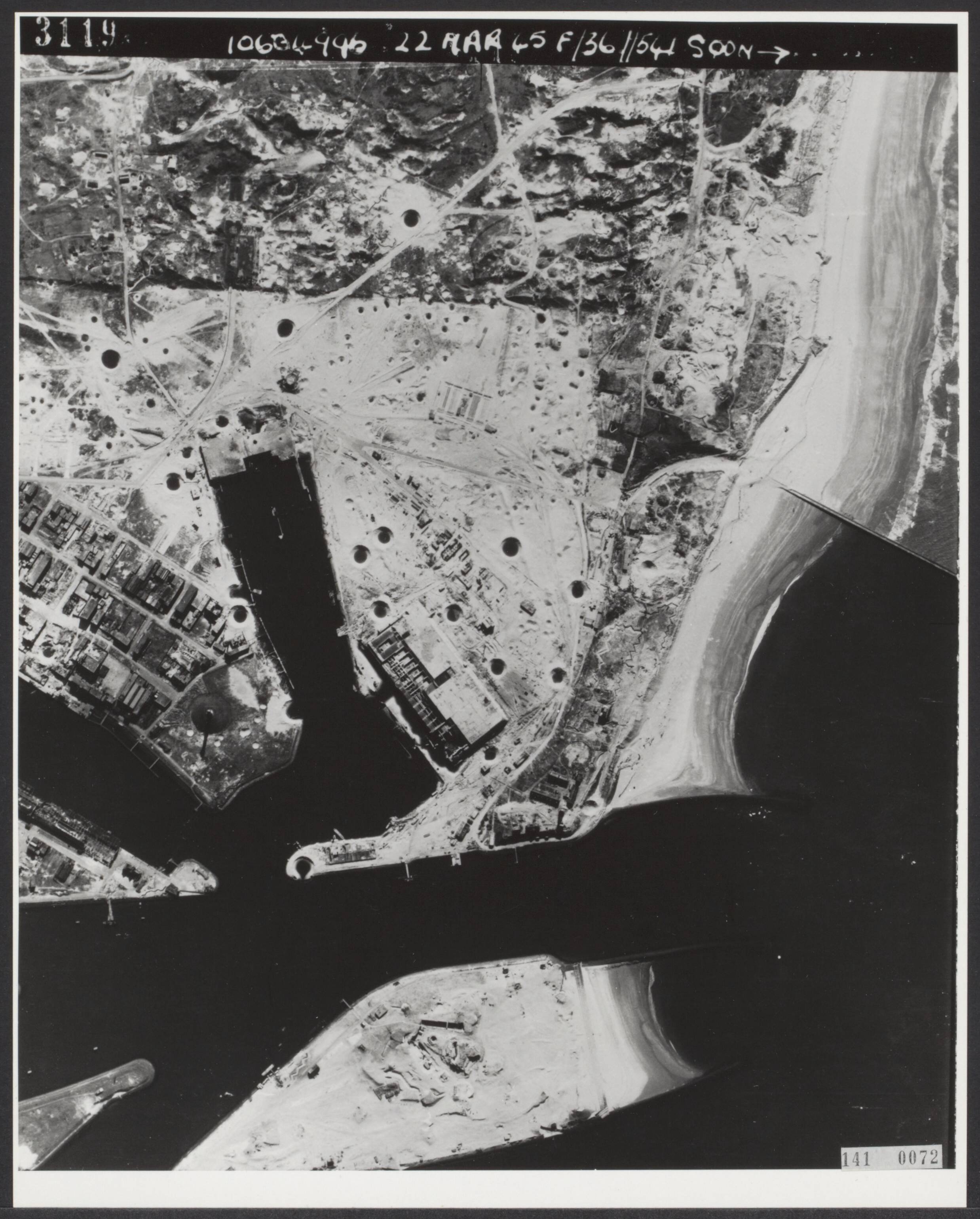 Luchtopname. De haven van IJmuiden. Direct na hun bezetting bouwden de Duitsers bij (1) een duikbootbunker en bij (2) een snelbootbunker. Vanuit deze haven uit opereert de Duitse Kriegsmarine tot het einde van de oorlog ondanks zware bombardementen van de Geallieerden. De laatste twee maanden van de oorlog operen de Duitser met hun nieuwste wapen, een tweemans-onderzeeboot, type Seehund. Veertig van deze boten brengen in kort tijd 120.000 bruto ton tot zinken