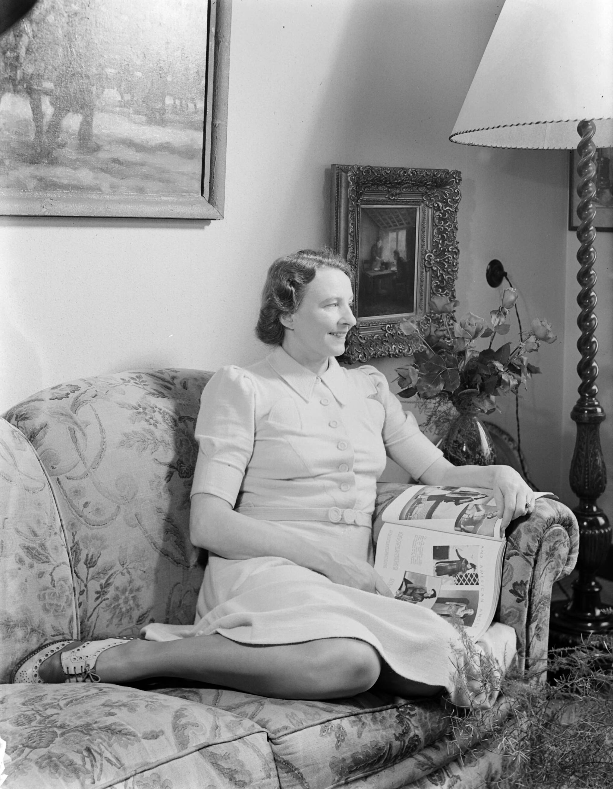 Mevrouw D. Smit poserend op een bank met tijdschrift