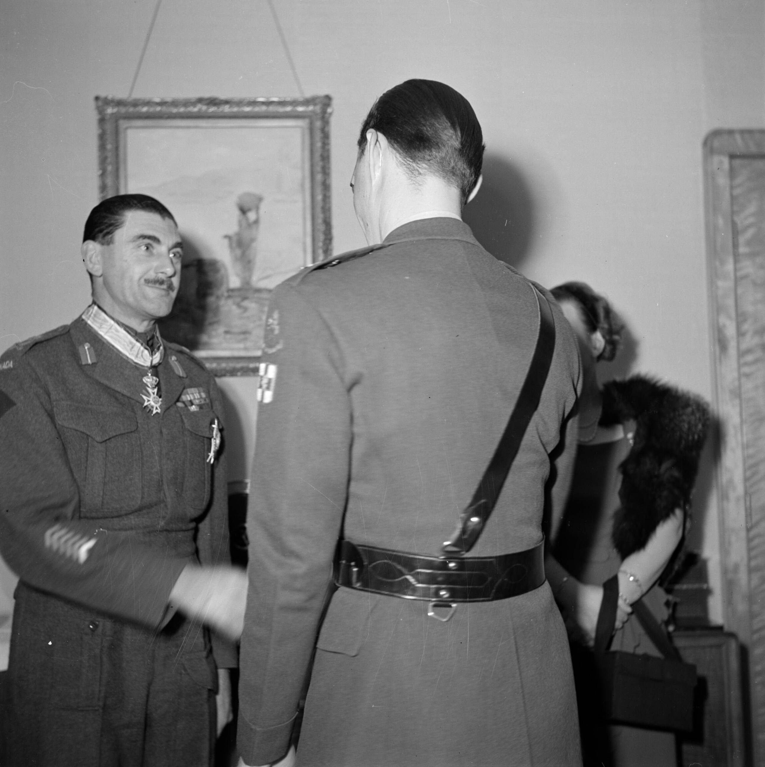 Prins Bernhard feliciteert de Canadese generaal Simonds