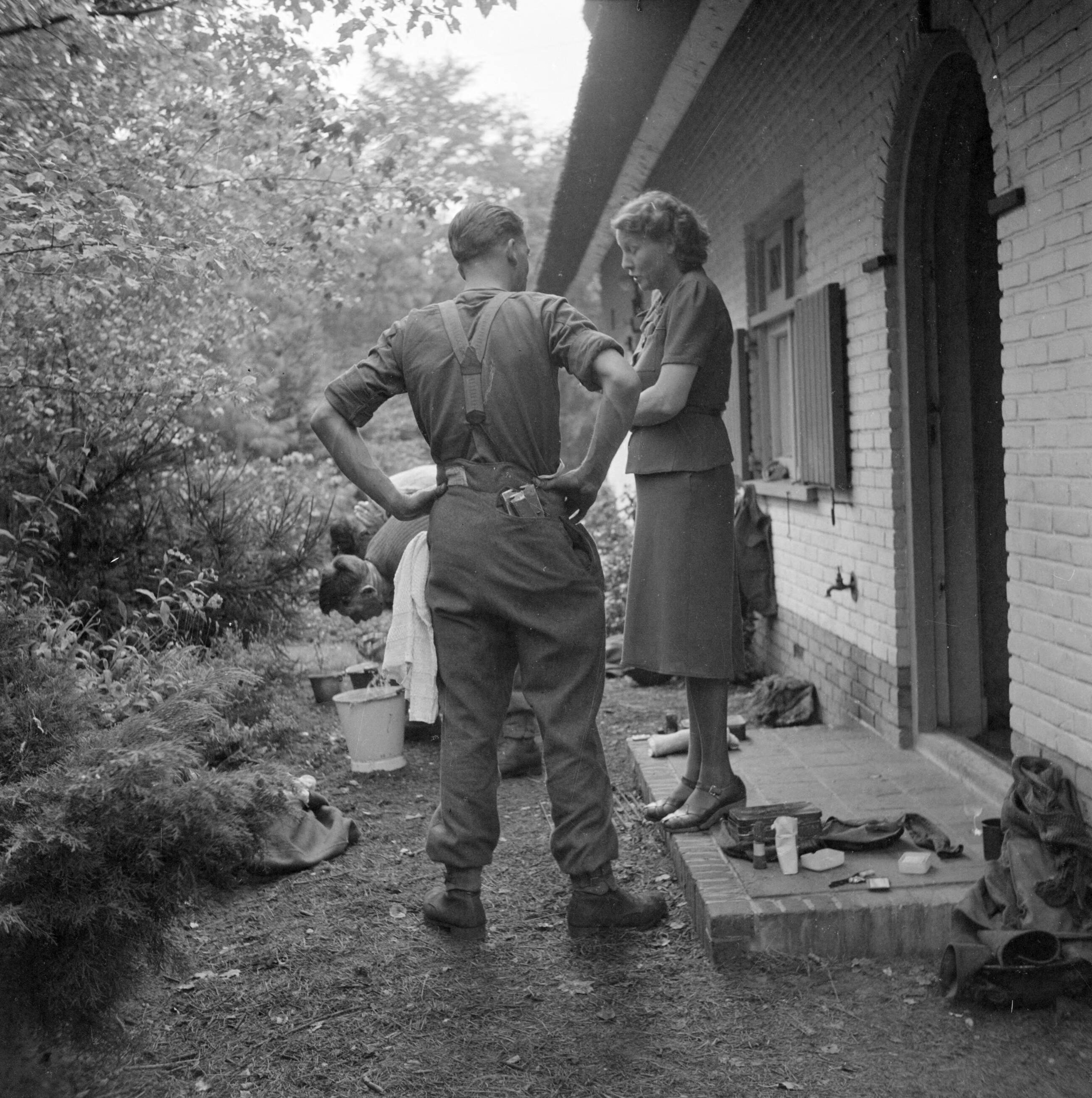 Militair van de Irish Guards in gesprek met inwoonster van Aalst, met op de achtergrond militairen die zich wassen