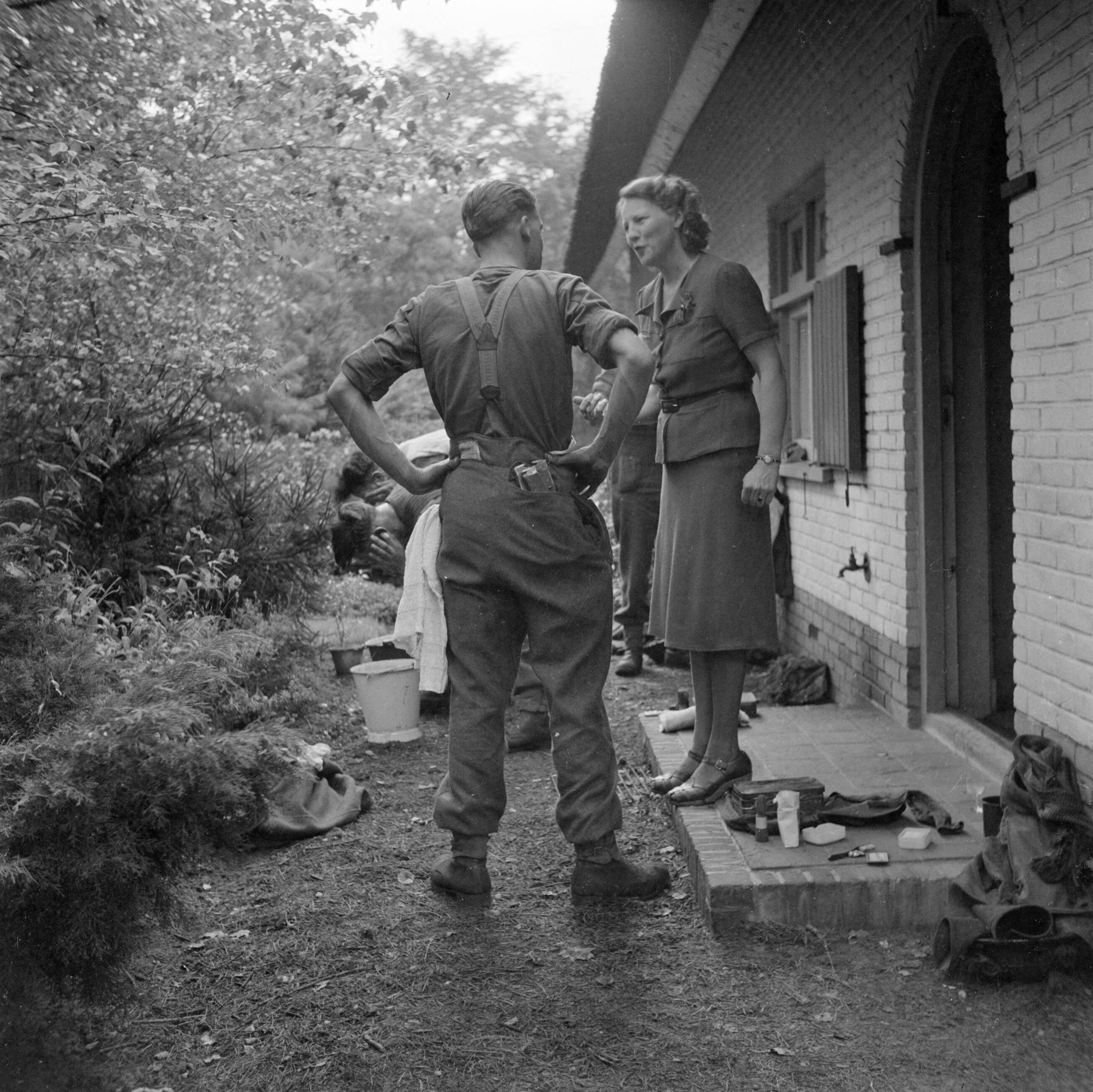 Militair van de Irish Guards in gesprek met inwoonster van Aalst, met op de achtergrond militairen die zich wassen