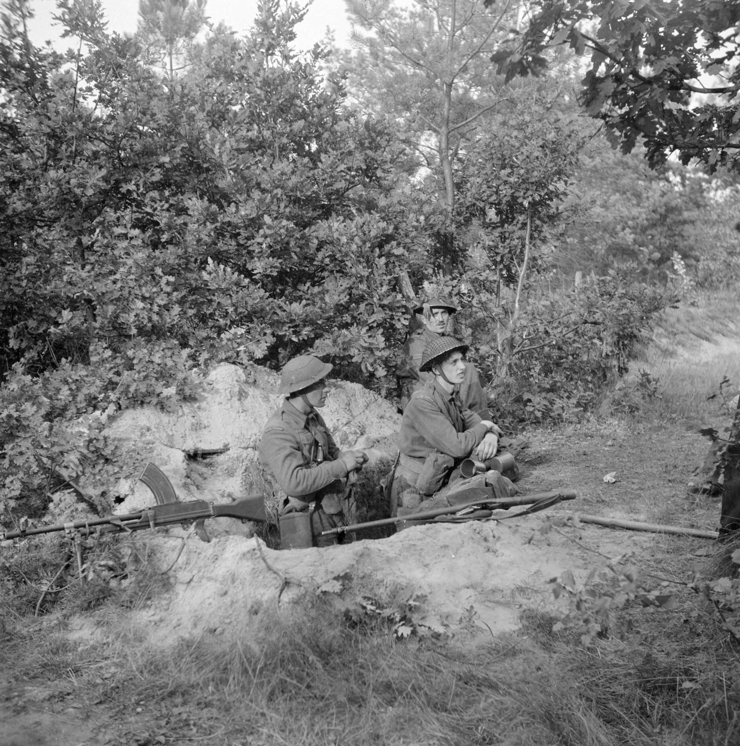 Militairen van de Irish Guards ingegraven aan de bosrand van Aalst