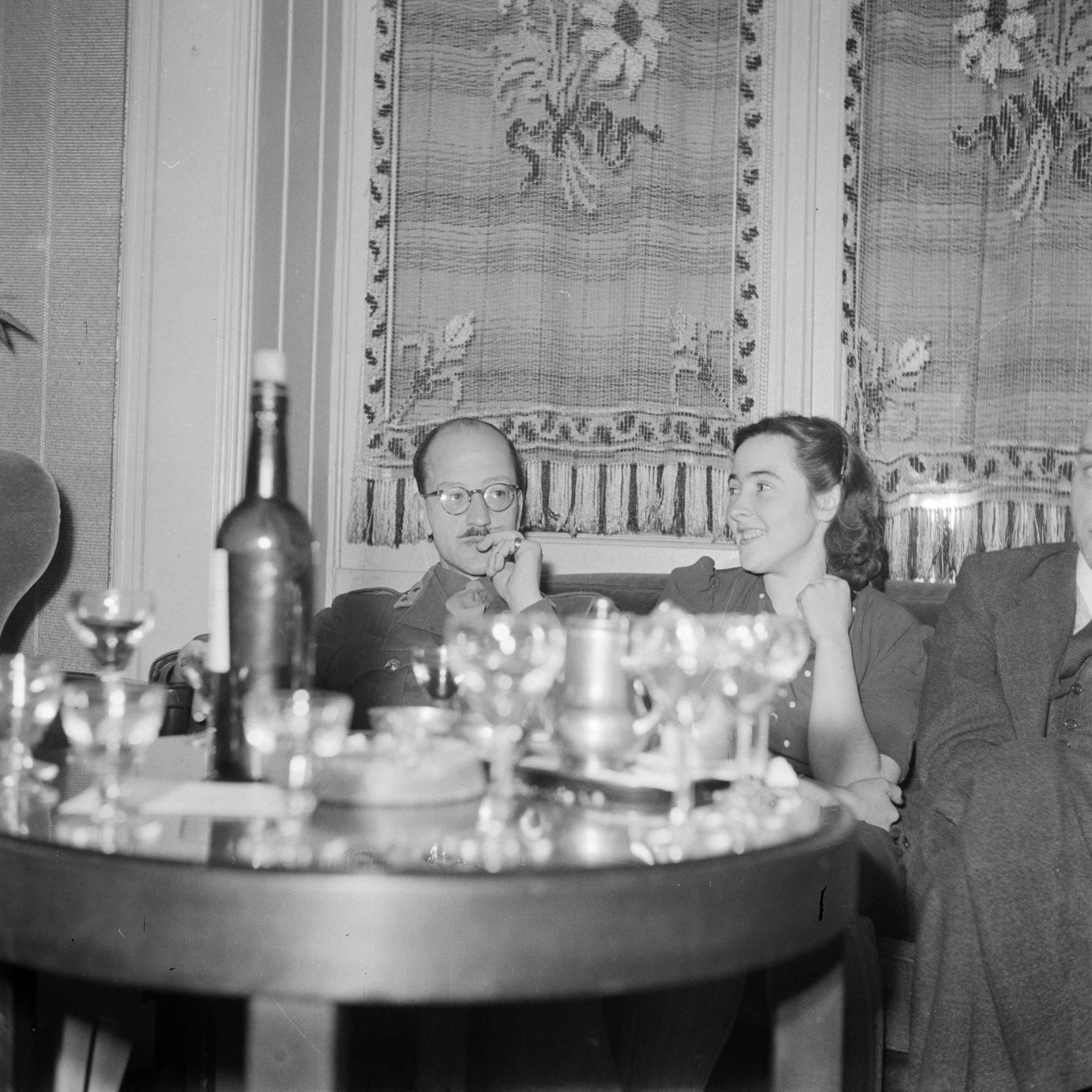 Kapitein Gerrie van Maasdijk, lid van de staf van prins Bernhard, zittend achter lege wijnglazen