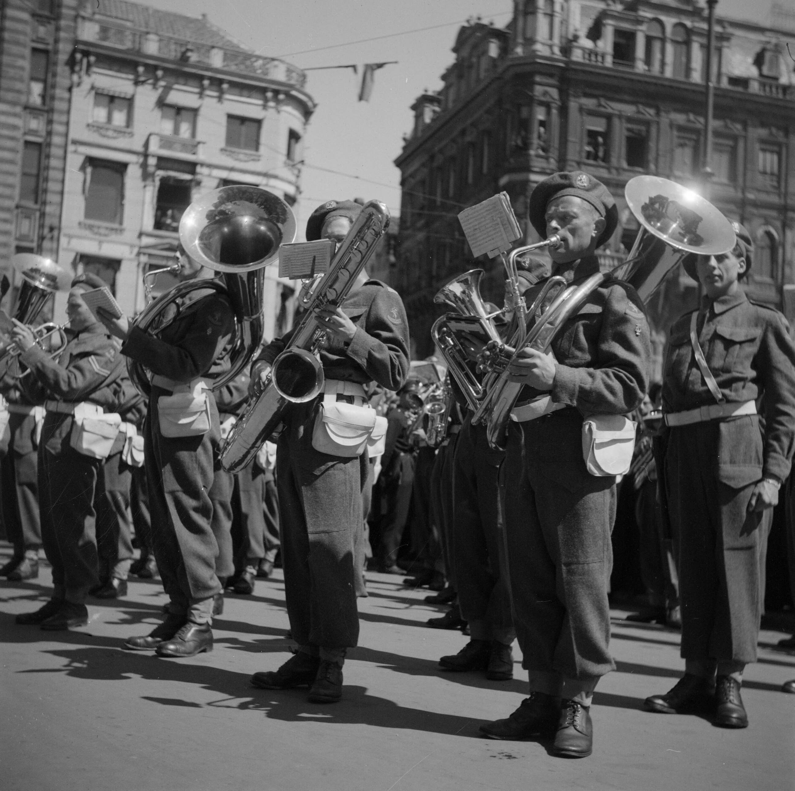 Leden van de Prins Bernhardkapel tijdens uitvoering voor het Koninklijk Paleis