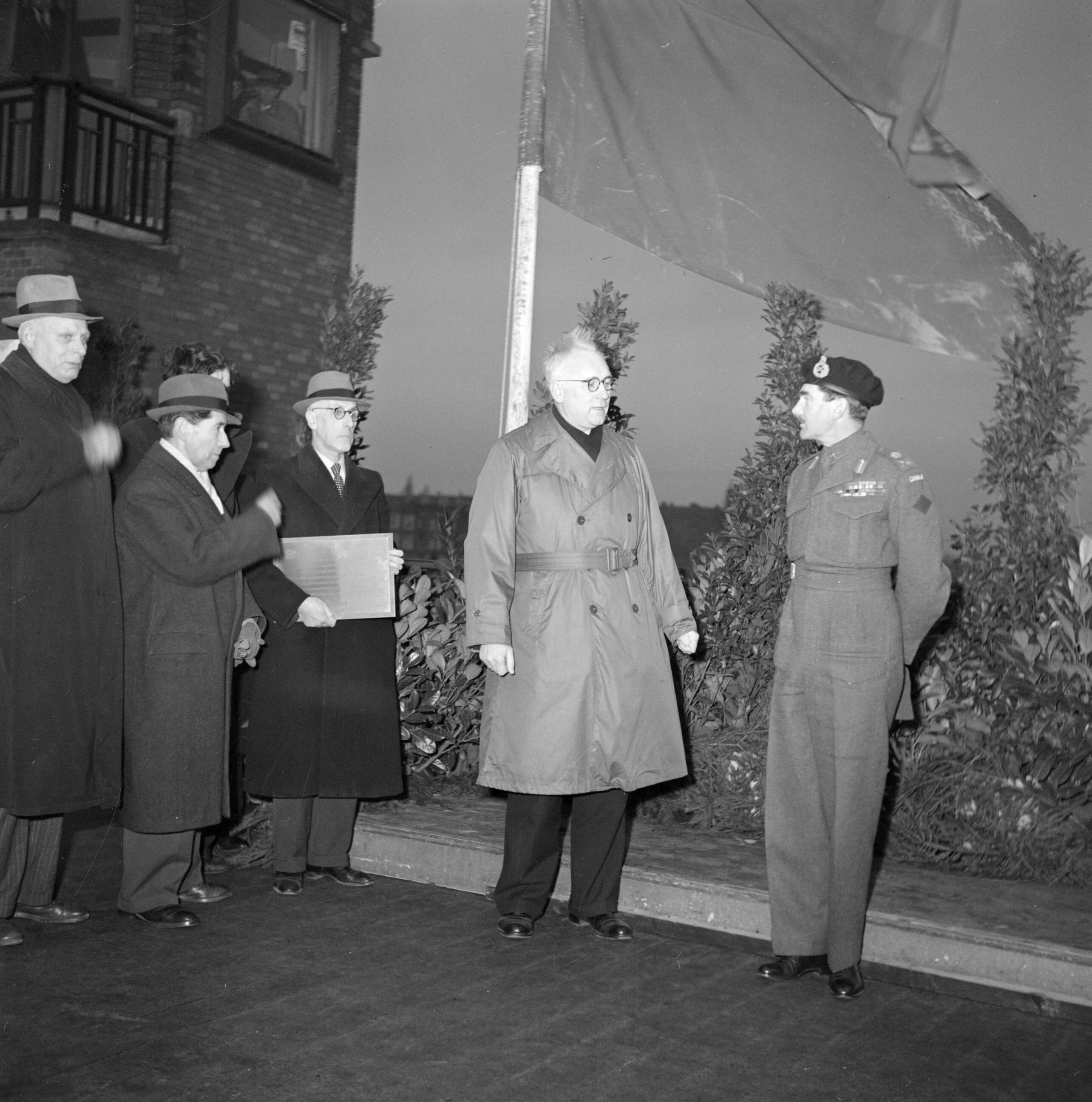 De Canadese luitenant-generaal Guy Granville Simonds ontmoet de Amsterdamse burgemeester Feike de Boer (met regenjas) en raadsleden op de Berlagebrug op 28 december 1945