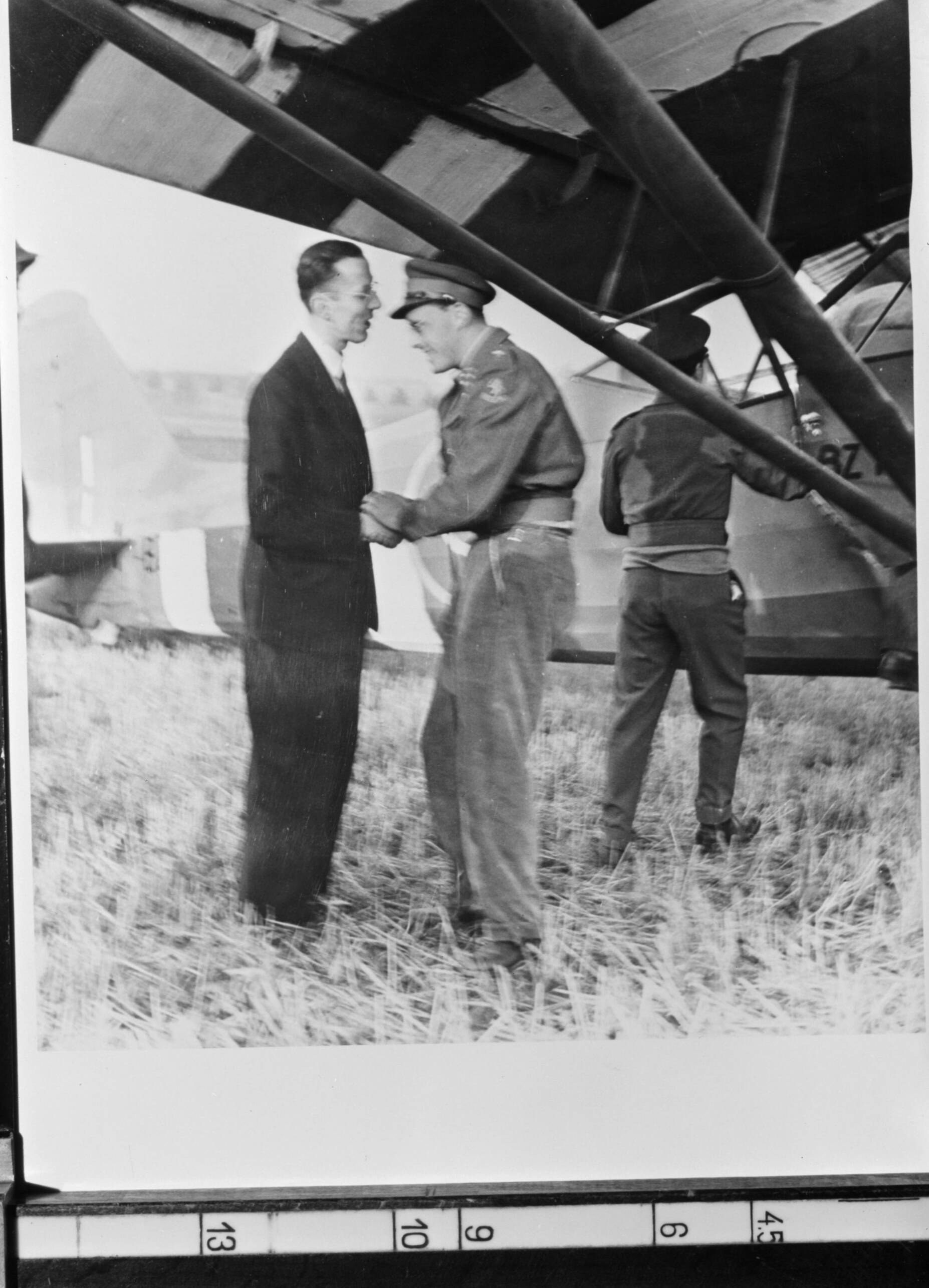 Maastricht, maandag 18 september 1944. Prins Bernhard wordt na zijn landing op de Bilserbaan begroet door Willem Baron Michiels van Kessenich, de burgemeester van Maastricht.