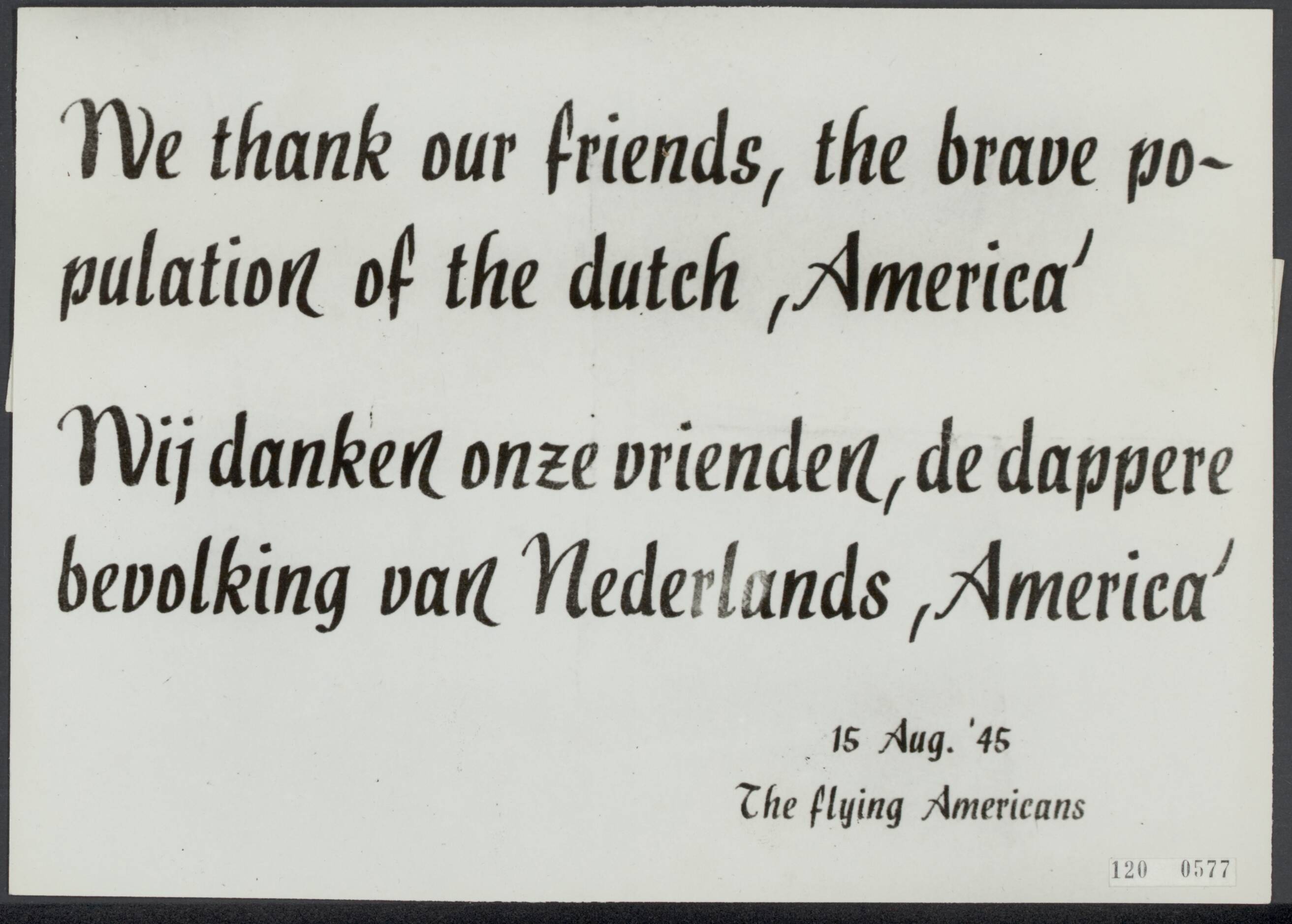 In het Peeldorpje America werden gedurende de oorlog 280 neergeschoten piloten door de organisatie Bert Poels verder geholopen. De Amerikanen hebben hun dankbaarheid getoond door op 15 augustus bij gelegenheid van de onthulling van een kruis, dat door de Duitsers was vernield, een krans uit te gooien. Dit pamflet werd met de krans uitgeworpen